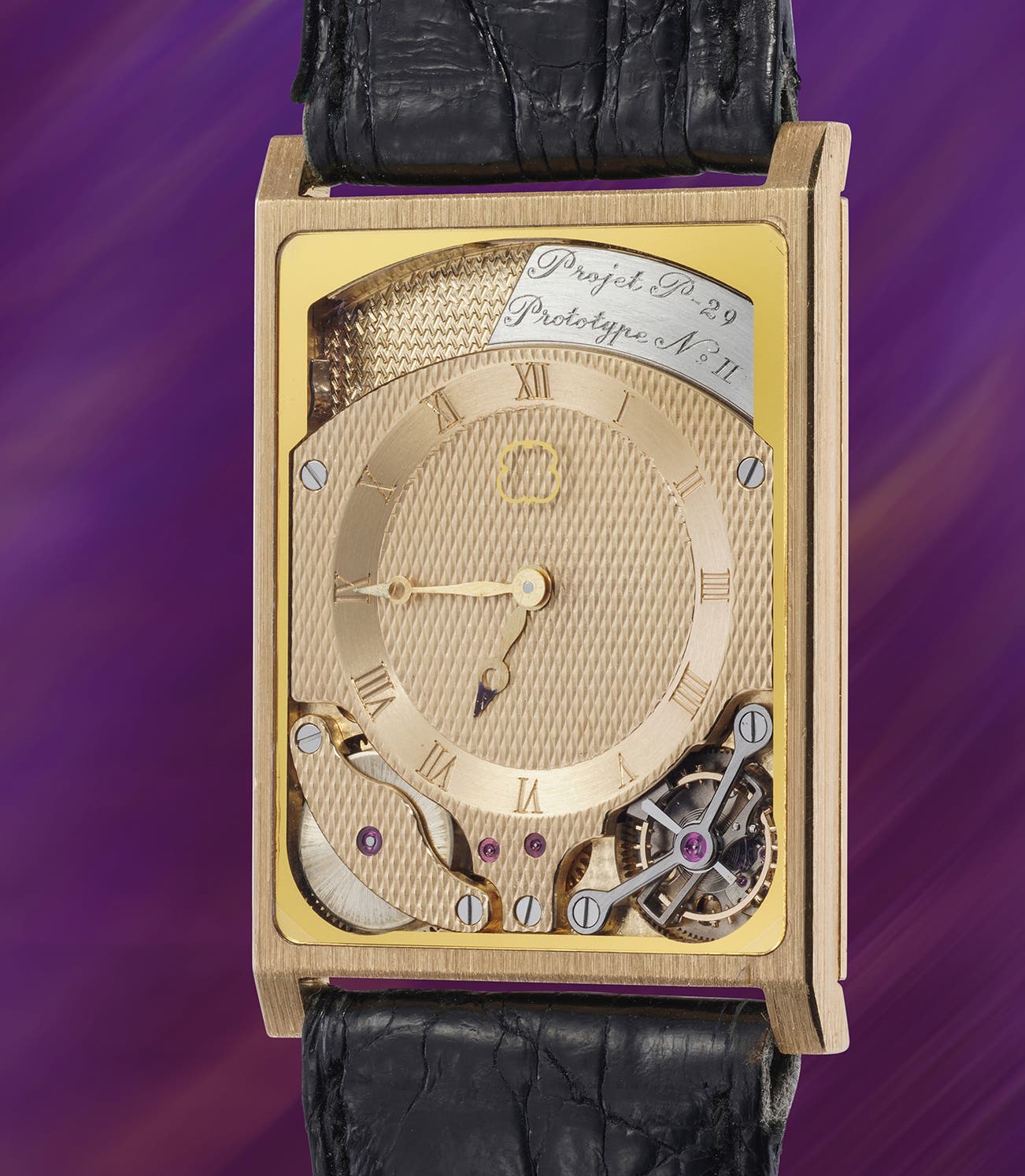 The present watch is a historically important creation of two brilliant engineers, Maurice Grimm and André Beyner. Renowned for their groundbreaking innovations, including the record-thin “Delirium,” they pushed horological boundaries with this prototype, the world’s first ultra-thin tourbillon with automatic winding. Just 2.7mm thick, it set a record by integrating the movement into the caseback and introduced a novel “hammer” winding system using a heavy platinum oscillating mass.