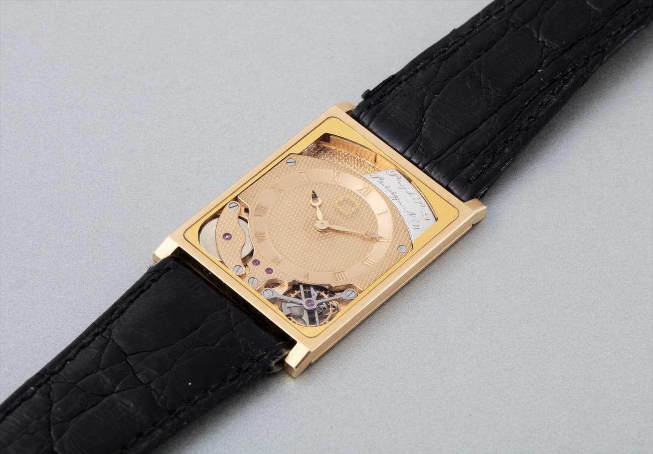 With this prototype, they succeeded in pushing watchmaking’s boundaries, as it was the world’s first ultra-thin tourbillon incorporating automatic winding. At only 2.7mm thick they established a record in thinness by integrating the movement with the case back. The implementation of the rotor was another challenge, resolved by the novel use of a “hammer” winding system. A heavy oscillating mass made of platinum swings through an arc limited by the width of the case, permitting the watch to be wound via the motion of one’s wrist. This project was acquired by Audemars Piguet, which subsequently launched their groundbreaking caliber 2870 in 1986. Housed inside reference 25643 with an overall thickness of just 4.8 mm, the caliber 2870 was a milestone in the history of watchmaking as it was, at the time, the thinnest serially produced tourbillon wristwatch ever made. The present lot is presented with a large folder containing the original drawings of Maurice Grimm describing the construction of the movement and each component. A true piece of watchmaking history, the present lot is a rare opportunity for the savvy collector.