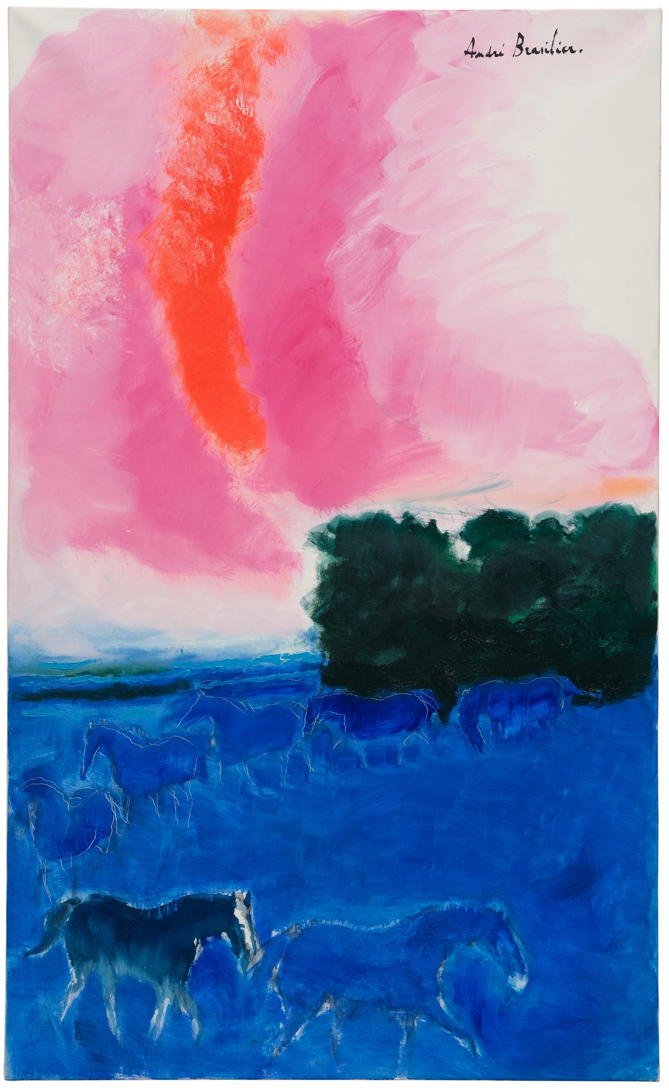 signed 'André Brasilier' upper right; further signed, titled and dated 'Ciel de Feu. André Brasilier 2017' on the stretcher