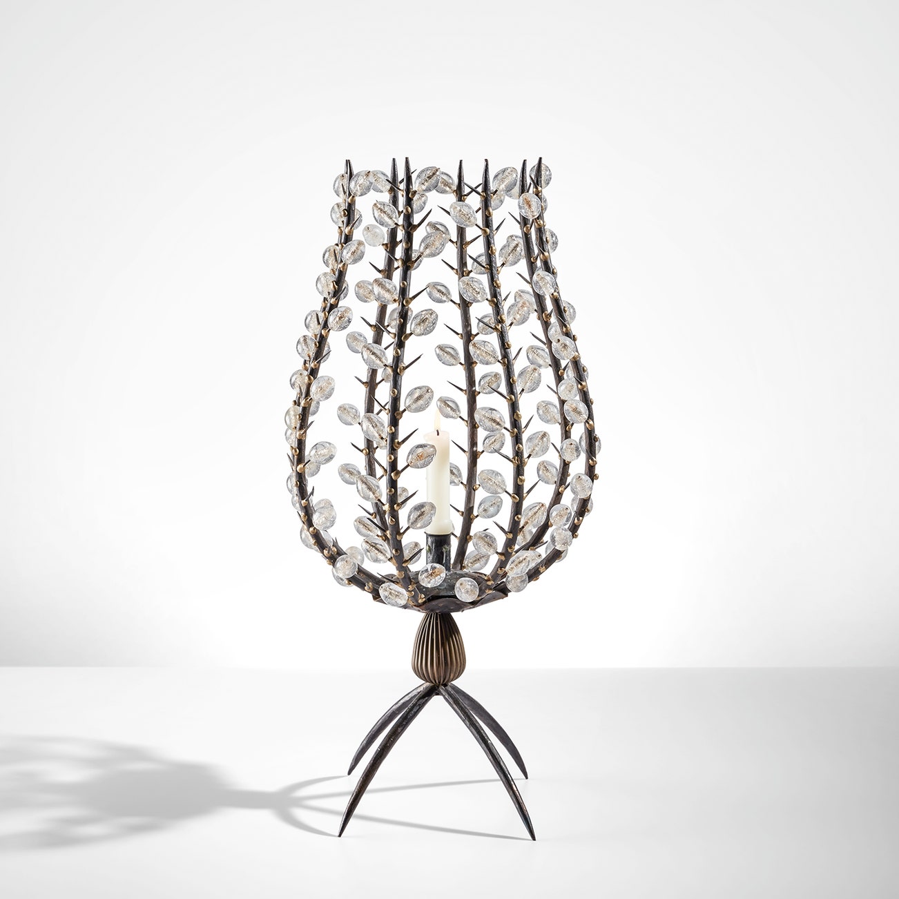 André Dubreuil created a series of works such as this candleholder — titled “Pearls” in English — that implement glass bead details. This early example is particularly rare — as the bronze component just above the four legs is pear-shaped rather than spherical, which was used in later examples. Only approximately eight of these examples were ever made.