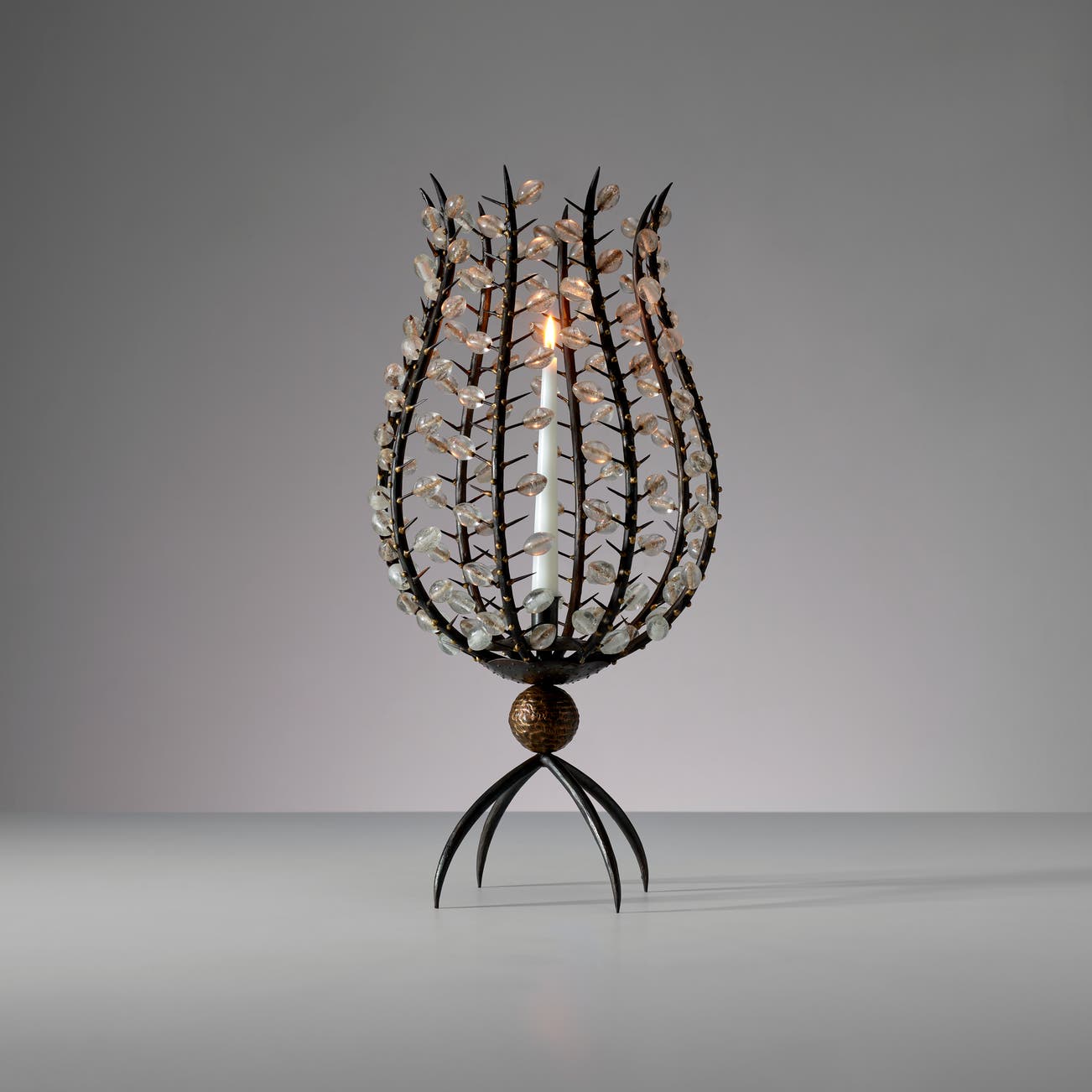 Patinated iron, brass, glass.