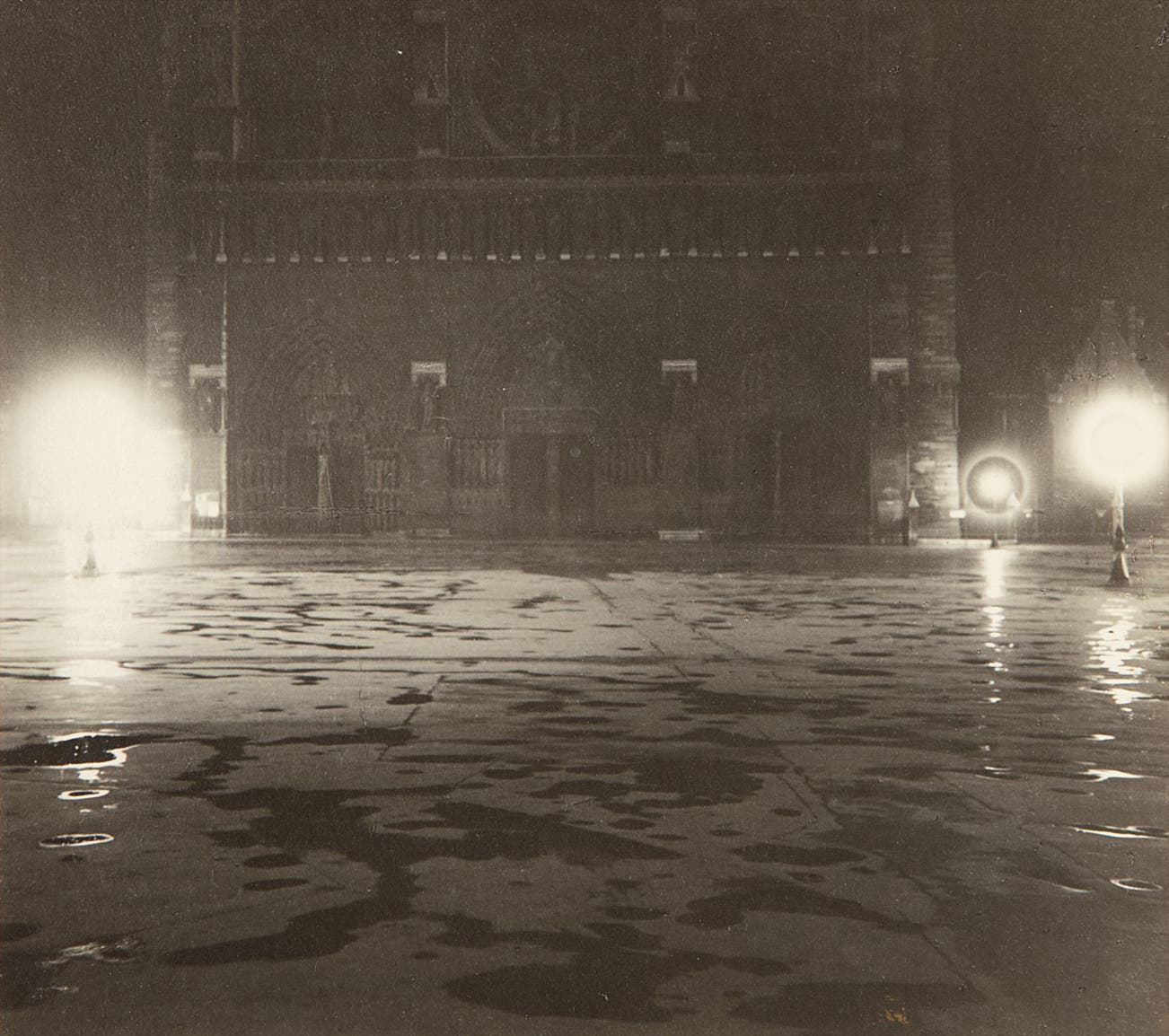 Following a brief military service as a photographer in his home country of Hungary, André Kertész moved to Paris in October 1925 and registered his profession as "photo reporter”. Enchanted by his new home, Kertész wandered the streets while taking pictures of the city: the Seine; the stairs of Montmartre; a jumble of chairs in the Jardin Du Luxembourg; and as seen in the current image, the swirls of wet pavement outside the hallowed cathedral of Notre Dame. What sets Kertész’s photographs apart from those of his peers working in Paris at the same time is their emotional resonance. That is, while other photographers’ depictions of Paris were concerned with capturing the familiar features of the city’s landmarks, Kertész’s depictions were subversive for his interest in the unexpected and unfamiliar views of the same locations. Through his subversive use of shadow, angle, subject, and composition, Kertész infused his subtle humanity into his photographs, which earned him acclaim during his time in France.