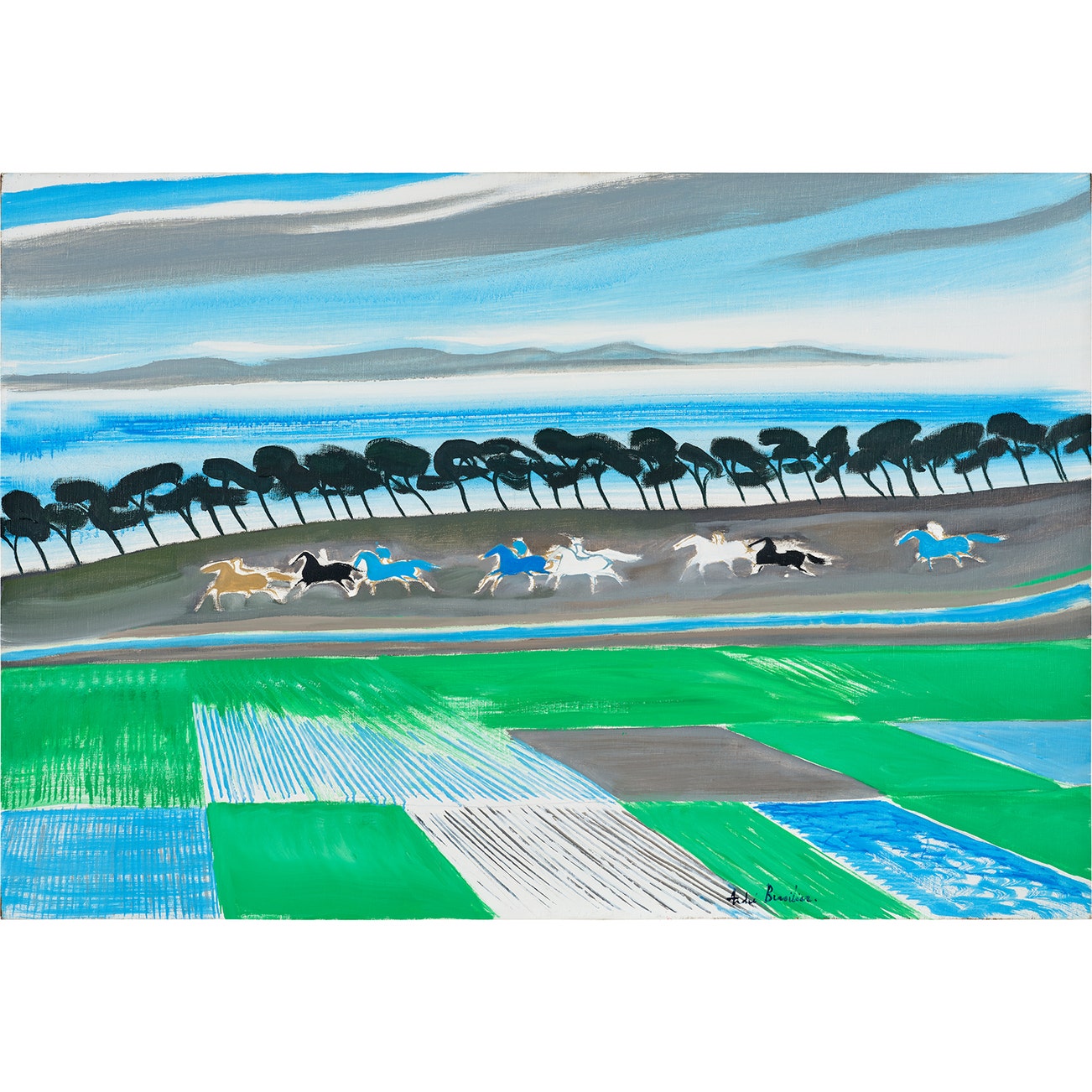 signed 'André Brasilier' lower right; signed with the artist's initials, titled and dated '"Souvenir d'Izu" A.B. 1989' on the stretcher