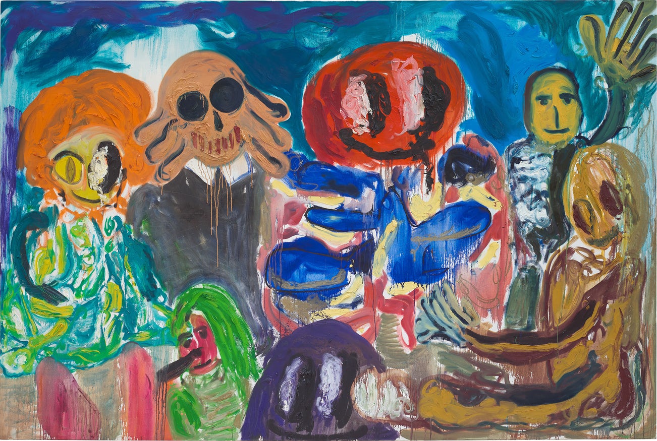 titled 'CHIPS UND PEPSI UND MEDIZIN' on the right side; inscribed 'TODALL, WELTWEIT ALL!' on the left side; signed, titled, inscribed and dated 'Todall, weltweit All! ''Chips und Pepsi und Medizin'' 24.1.2003 A. Butzer '03' on the reverse