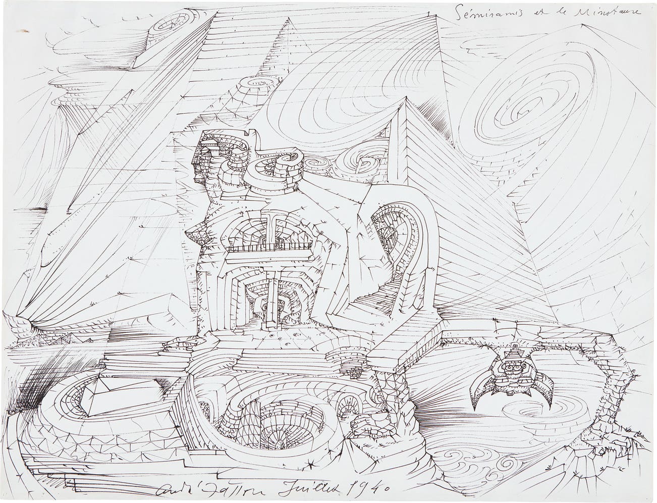 signed and dated "André Masson Juillet 1940" lower edge; titled "Sémiramis et le Minotaure" upper right; further inscribed and titled "II Sémiramis et le Minotaure" on the reverse