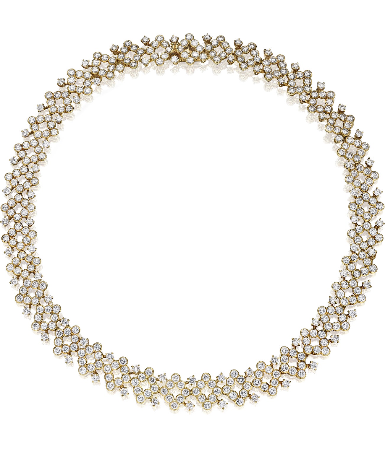 Designed as lozenge-shaped links set with brilliant-cut diamonds each supporting two brilliant-cut diamonds, mounted in 18K yellow gold, length approximately 16 1/4 inches, French assay mark and maker's mark for André Vassort.