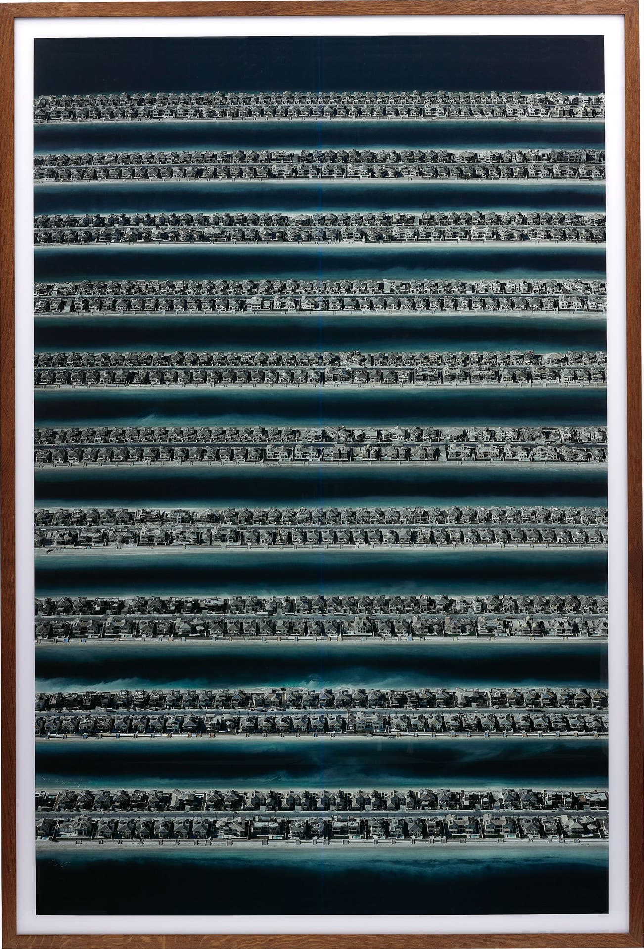Executed in 2008, Jumeirah Palm is an iconic example of Gursky’s linear and homogenous photographic work. Seen from afar, this piece is dominated by repetitive horizontal stripes of gradient hues of blue and grey. Only once the viewer steps closer, rows of uniform luxury villas shot from an aerial perspective reveal themselves. As the title suggests, this large scale work was shot on the Palm Island in Dubai. The photograph emphasises the simultaneous co-existence of order and chaos, and the contrast between the natural and the built environment. The digitally modified pattern created by the artist generates transitive parallels between his practice and human behavioural tendencies to modify our own natural habitat.