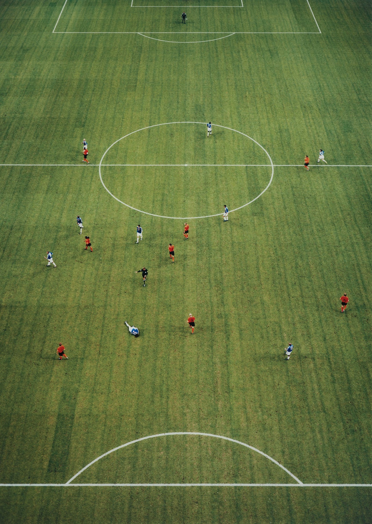 Shooting from what seems an impossibly elevated vantage point, Gursky captures a scene so distant that viewers are removed from the details of the match unfolding below. He crops the field so as to show only a selection of isolated players and eliminates the crowd populating the stadium. Without a horizon line to orient the viewer, the picture plane is completely flattened thereby bringing focus to the grid-like pattern of the grass and the white markings that divide it. By abstracting the scene in the way that he does, Gursky creates an image whose subject is as much the formalist tenets of color, line and composition as it is the soccer match itself. Gursky reinforces the connection between this image and painting through its impressive size which, at nearly 9 x 7 feet, rivals the scale of canvases by 20th century masters such as Mark Rothko and Jackson Pollack, among others.