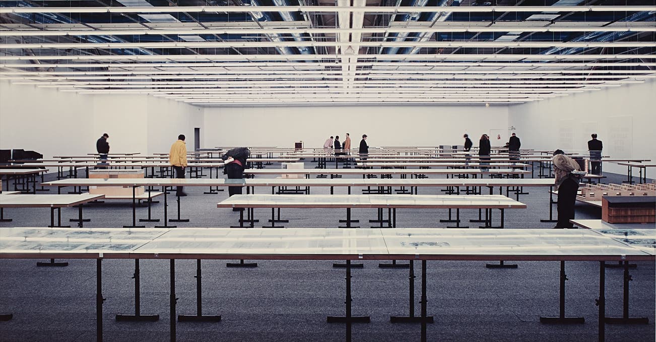 In the current lot Gursky depicted the mezzanine hall at the famed French institution during the 1995 exhibition of the works by the architects Herzog & de Meuron. The format of the exhibition, which was designed by Swiss artist Remy Zaugg, was unusual, whereby parallel rows of low-lying display tables reflected the rows of strip lights and exposed ventilation shafts lining the ceiling above them. In fact, the exhibition resembled an assembly line at a factory more so than a traditional museum exhibition. The overall feel of the exhibition was austere and sterile, and by evoking the atmosphere of a factory Zaugg was arguably commenting on the evolution of architecture from a means of personal expression to that of mass accommodation.
