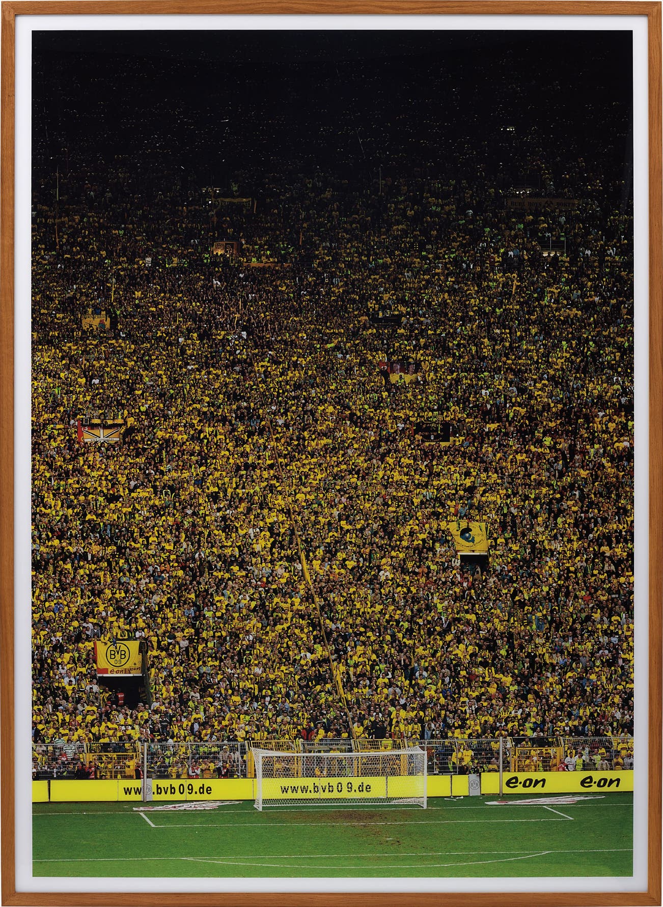 It is this very artistic and photographic style for which the acclaimed photographer is most renowned, that is masterfully displayed in Dortmund, 2009. This in turn, is highly representative of the acclaimed photographer's later works' defining artistic features. For what could be more quotidian than a sports game? It allows the viewer to realize how non-confrontational or controversial the image is, despite its impacting large format. The scene further discloses in a very subtle and inadvertent manner beauty and indifference, and in a slightly humorous way. Nevertheless, Gursky permits his viewer to distinguish the sublime and superficial elements in his works. Where the sublime in this case could arguably be seen in the chaotic and massive multitude of uniformed people, and one can almost sense the thrill, and hysteria of the crowd. The sheer amount of people, and sense of scale and proportion in the photograph also allude to the excitement and importance of the event. This illustrates his fondness for what Maire Luise Syring suitably states, are the “all over compositions”, that basically fill the entire surface of the picture, which is very boldly achieved in Dortmund. Yet Gursky tends to purposefully reduce, and almost completely diminish individuals, presenting them as a multitudinous mass, or a “concrete manifestation of economic interests, production mechanisms, or capital investments.” All of which are highly representative of Gursky's unique artistic style and conceptual enrichment of contemporary photography.