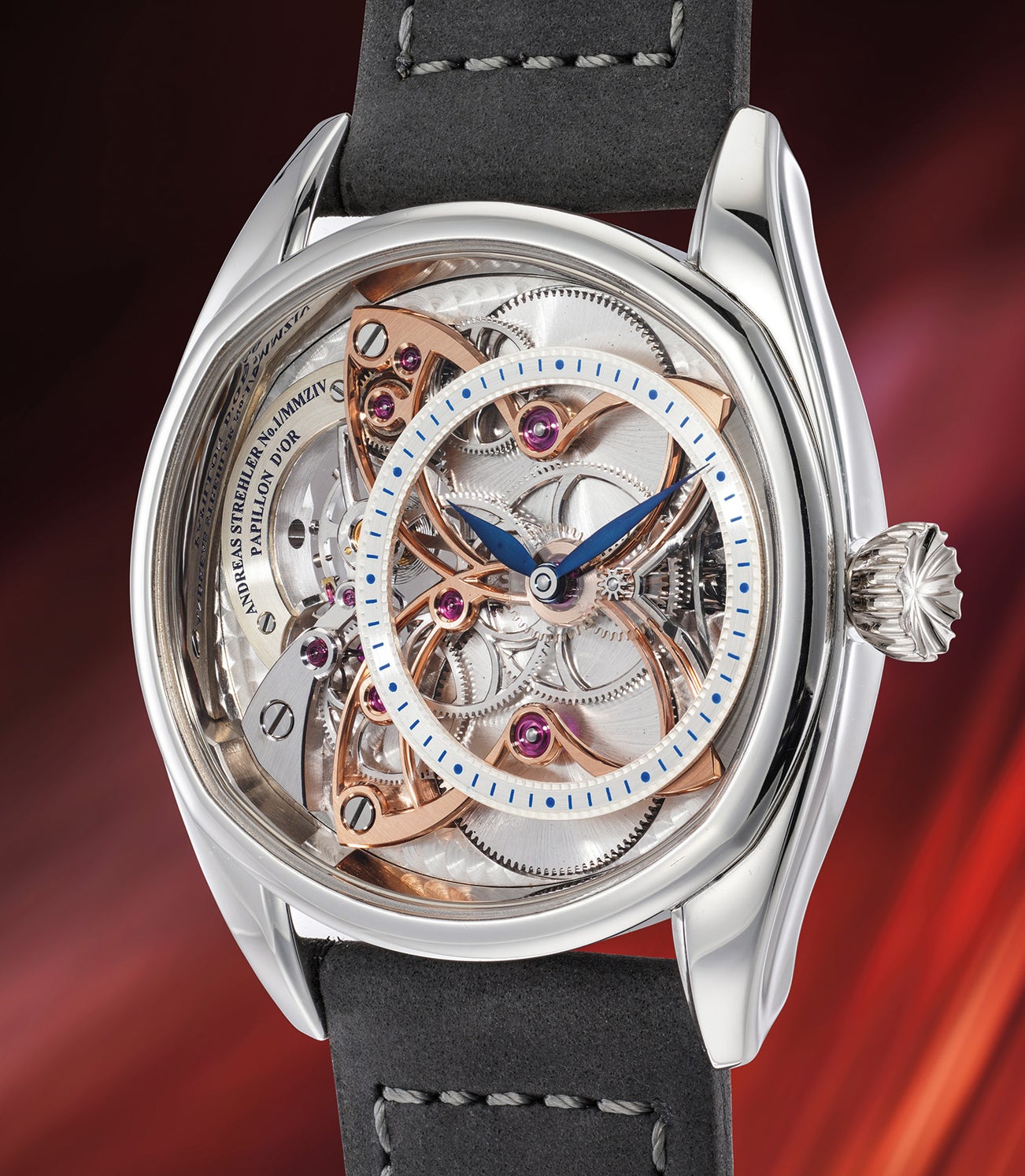 After having worked at Renaud & Papi, Strehler set out on his own in 1995 as an independent watchmaker and 3 years later presented his first timepiece and has ever since continued creating complicated movements for others and under his own name. The Papillon d’Or (French for gold butterfly) takes its name from the golden bridges shaped like a butterfly holding the superbly finished gear train with its two sapphire crystal gear wheels and supports the white fired silver dial ring. The finishing of the movement – that is completely openworked – is fascinating, as each and every component has been painstakingly finished by hand, whether black polishing, circling and angling. It is important to note the incredible number of interior angles (one of the most complex and difficult types of angling to master consisting of a sharp break between two angles). The two barrels provide the watch with 78 hours (slightly above 3 days) power reserve. A power reserve indicator can be found on the back of the movement and linked to the balance cock. According to Strehler this incorporates what is probably the world’s smallest differential gear.