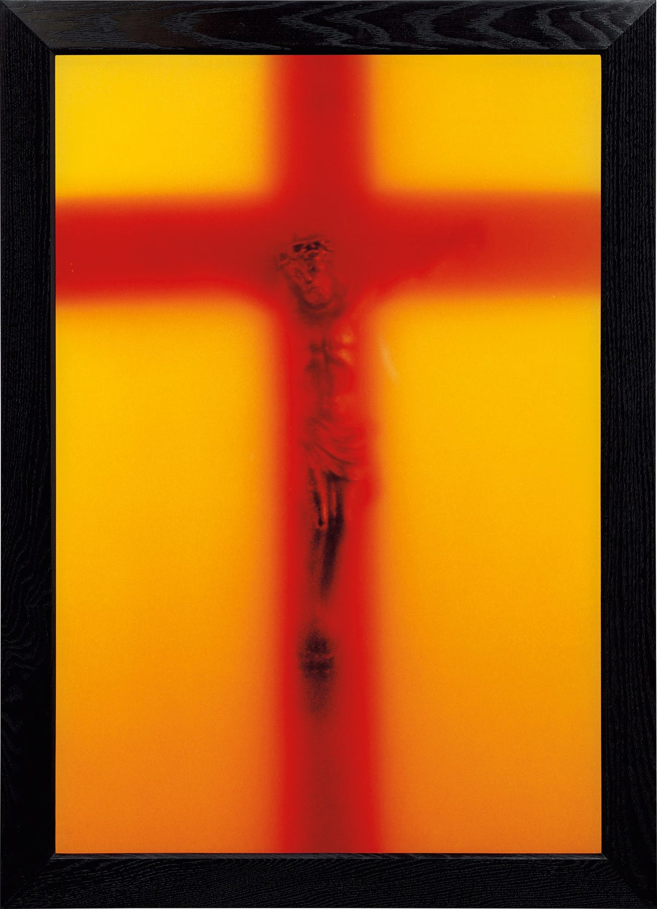 Immersions depicts universally recognizable symbols of reverence, from Classical busts and Roman athletes to the Pietà and the Madonna, submerged in bodily fluids. No other images from the series, however, provoked a stronger reaction than that of Jesus on the cross. In Piss Light, the figure of Jesus Christ emerges from an amber-colored glow. The rich tonality and the striking composition invite further inspection, marrying a strong visual appeal with powerful conceptual statement. The sense of duality is further enforced by the title, one word referencing human physical matter, the other spiritual salvation.