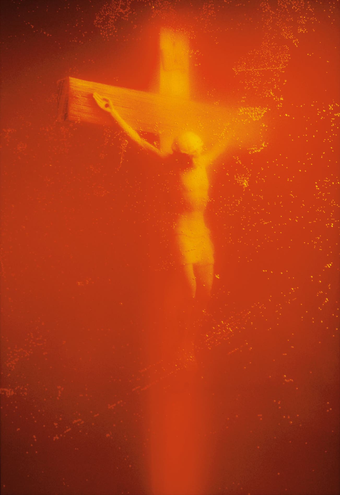 With a title that immediately informs us, it is at once visually captivating and discomforting: a powerfully lit golden crucifix, slightly askew, emerges from profuse, sumptuous oranges and reds. Illuminated, infinitesimal air bubbles populate the foreground, almost as if instead of viewing a photograph, our eyes are looking directly through the Plexiglas that holds its subject. Serrano’s chosen plastic Christ figurine eschews an emphasis on the frailty of human flesh, and instead the solid, molded form functions as an icon, interrogating the rigidity of belief through its profane baptism.