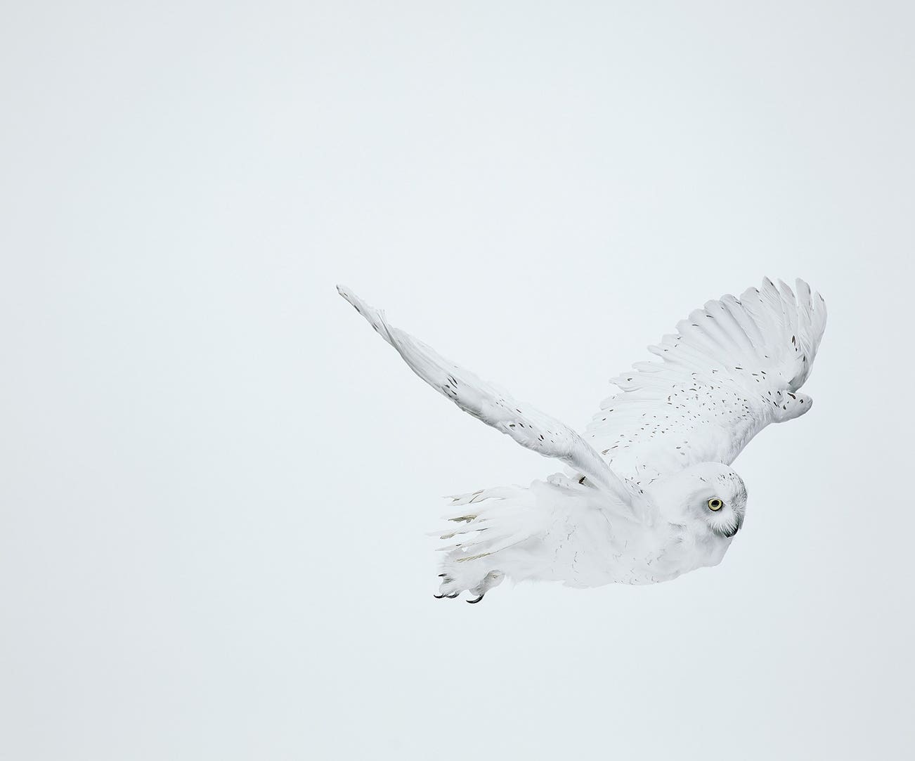Andrew Zuckerman’s work harnesses elements of the natural world through technology. In this photograph, the snowy owl captured mid-flight in the artist’s New York City studio is untethered from its contextual environment. The artist’s signature white backdrop provides an almost hyperreal representation of the owl – with precision and clarity – illuminating its golden eyes all the way to the tips of its white wings. 'Birds are brilliant creatures,’ comments Zuckerman, ‘and behind their visual beauty I think there is something that mystifies all of us.' His process of UV printing onto Dibond not only resulted in a certain sensitivity to the tones of white as seen in this work but also allowed it to be presented without glazing, creating an unobstructed connection between the viewer and the subject. His books have been published in 18 international editions and his immersive investigation of the natural world has been presented in three volumes: Creature (2007), Bird (2009) and Flower (2012).