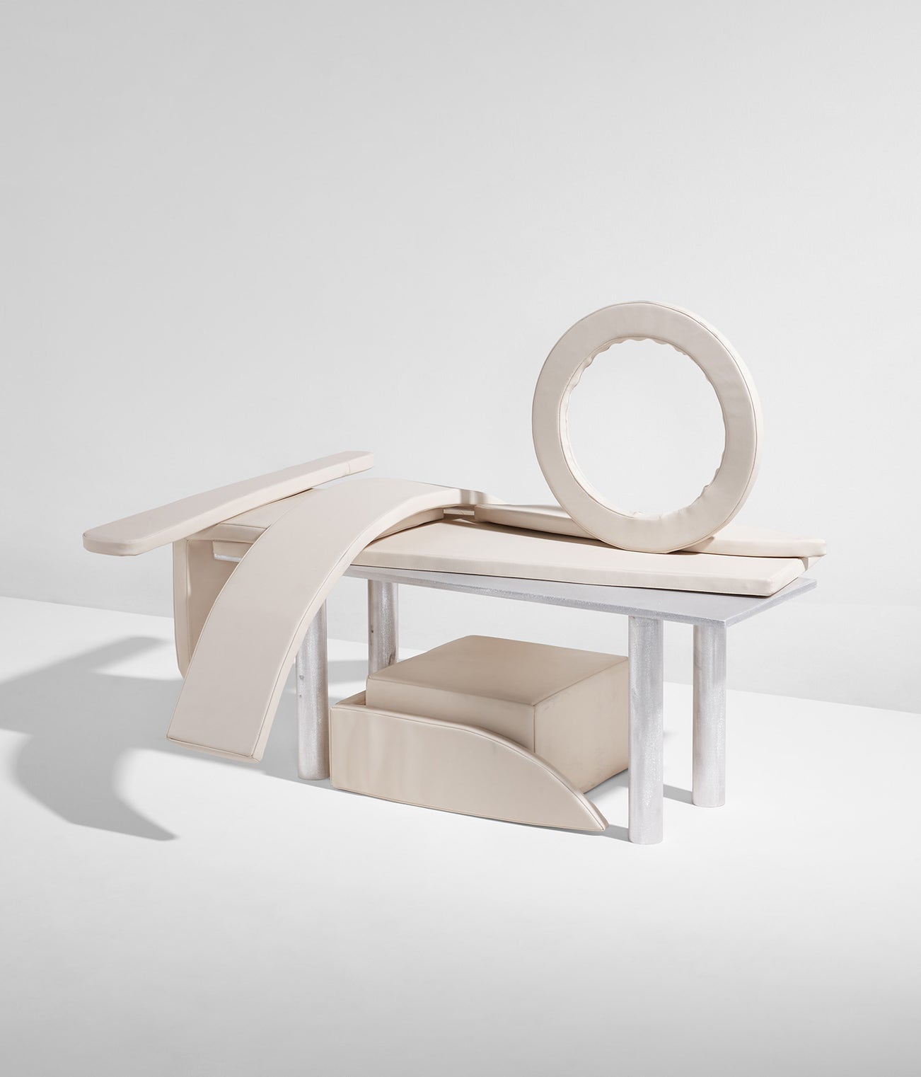Andy and Dave is an architecture and design studio based in Brooklyn, New York whose concept-driven work explores ideas that they describe as “free from academic or market-imposed constraints.” They have designed two pieces of furniture that explore specific and somewhat-hidden locations in New York City. For their “Wanna go there! (Screen)” (lot 54), they looked to the fireplace designed by Robert Winthrop Chanler that dominates the former loft of Gertrude Vanderbilt Whitney and the original site of the Whitney Museum. The room divider’s form mirrors the sculptural flames of the fireplace which were photographed and printed on vinyl. For their “Where is this? (Bench)” (lot 55), the designers took artist Louise Nevelson’s Chapel of the Good Shepard at Saint Peter’s Church as inspiration; it is almost as if Nevelson’s monochromatic wall sculptures have come loose and transformed into the mobile vinyl-upholstered forms of Andy and Dave’s bench. Describing these two sources of inspiration, Andy and Dave have said, “Both are unsung, culturally significant interiors where the boundaries between art and architecture have been blurred.”
