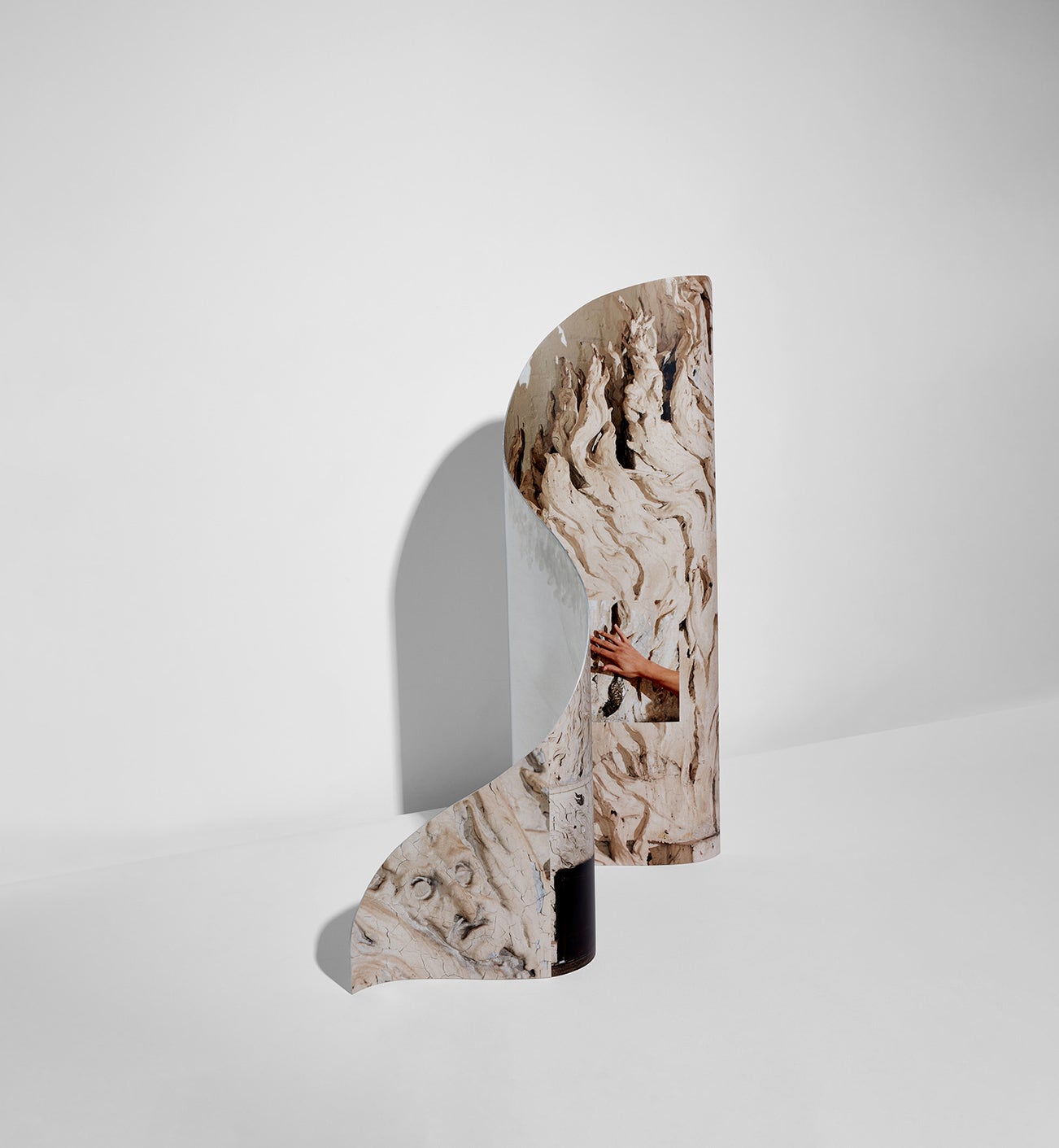 Andy and Dave is an architecture and design studio based in Brooklyn, New York whose concept-driven work explores ideas that they describe as “free from academic or market-imposed constraints.” They have designed two pieces of furniture that explore specific and somewhat-hidden locations in New York City. For their “Wanna go there! (Screen)” (lot 54), they looked to the fireplace designed by Robert Winthrop Chanler that dominates the former loft of Gertrude Vanderbilt Whitney and the original site of the Whitney Museum. The room divider’s form mirrors the sculptural flames of the fireplace which were photographed and printed on vinyl. For their “Where is this? (Bench)” (lot 55), the designers took artist Louise Nevelson’s Chapel of the Good Shepard at Saint Peter’s Church as inspiration; it is almost as if Nevelson’s monochromatic wall sculptures have come loose and transformed into the mobile vinyl-upholstered forms of Andy and Dave’s bench. Describing these two sources of inspiration, Andy and Dave have said, “Both are unsung, culturally significant interiors where the boundaries between art and architecture have been blurred.”