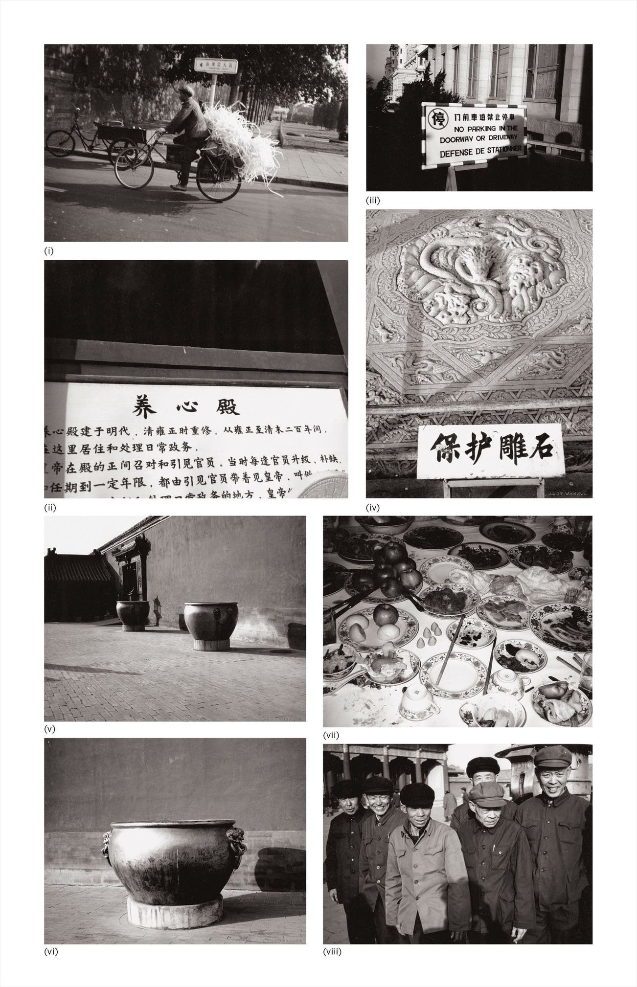 Eight works: (i) Street Scene (Man on Bicycle); (ii) Sign in Chinese; (iii) "No Parking" Sign; (iv) Chinese Sculpture; (v) Temple; (vi) Urn; (vii) Restaurant Table; (viii) Men