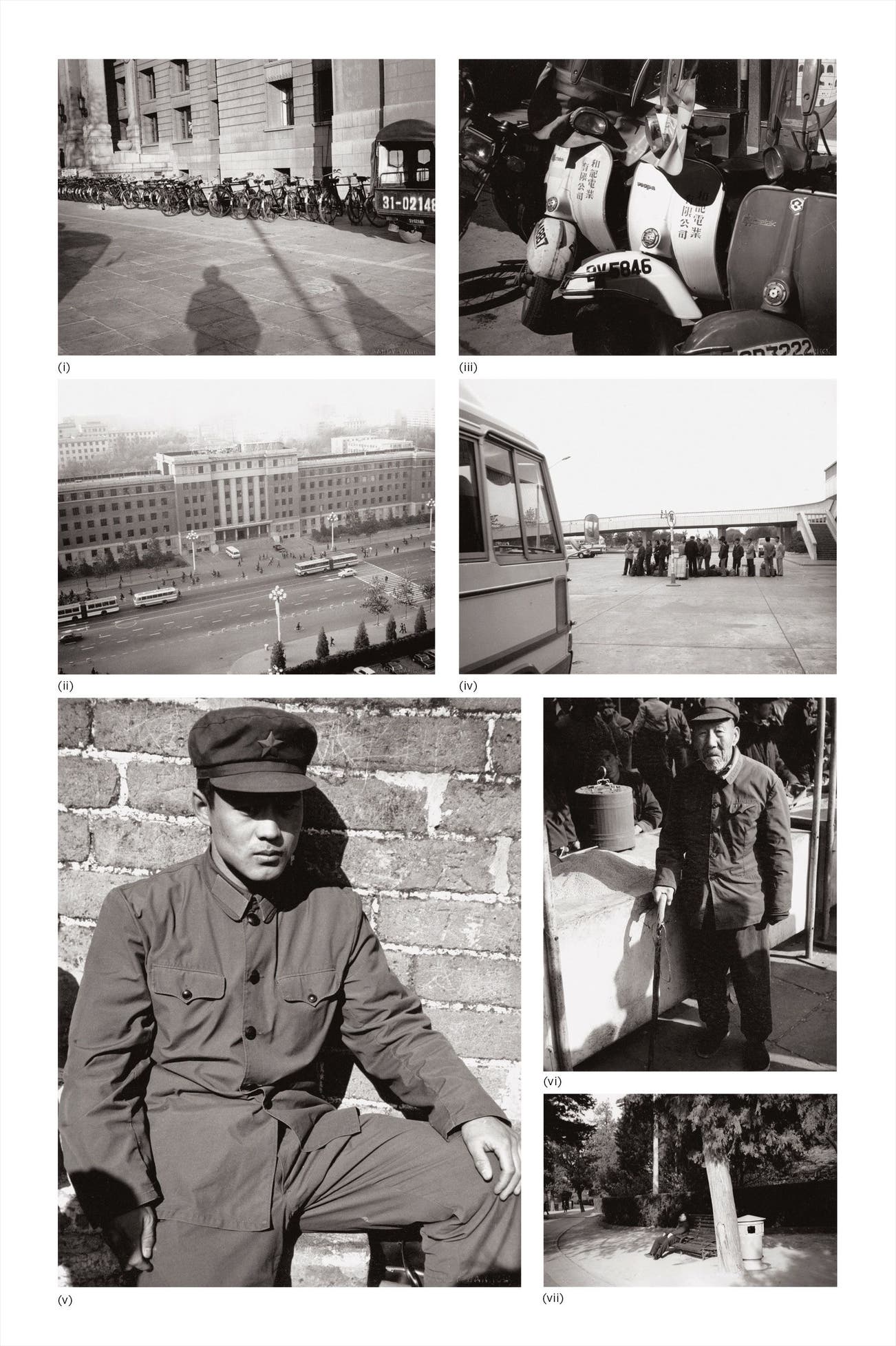 Seven works: (i) Street Scene (Bicycles); (ii) Gate and Statue of Mao; (iii) Scooters; (iv) Airport Parking Lot; (v) Young Man at Great Wall; (vi) Old Man; (vii) Park