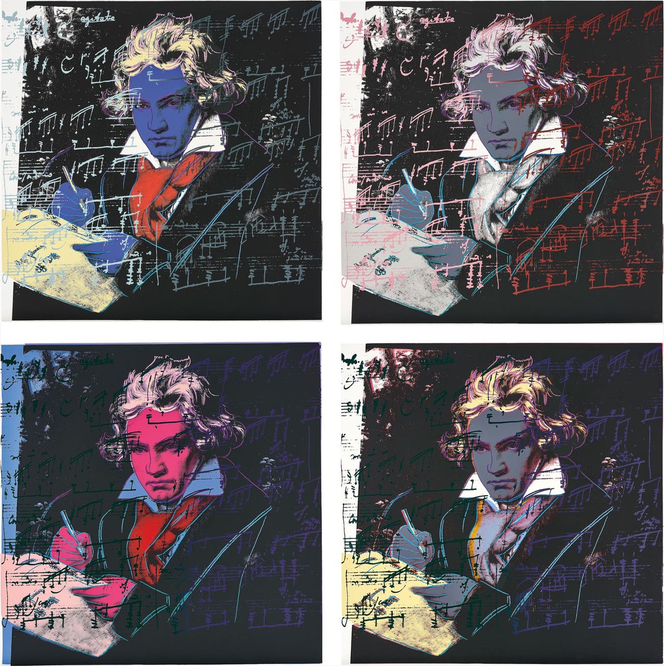 Created in 1987, shortly before his death, Warhol’s quartet of portraits of Ludwig van Beethoven (1770-1827) perfectly demonstrates the artist’s ability to manipulate and appropriate imagery to create a visual icon. For this set of screenprints, Andy Warhol took an already famous image of the German composer: an idealised and heroic portrait painted in 1820 by Joseph Karl Stieler (1781-1858), which has coloured our view of Beethoven’s personality and appearance unlike any other.