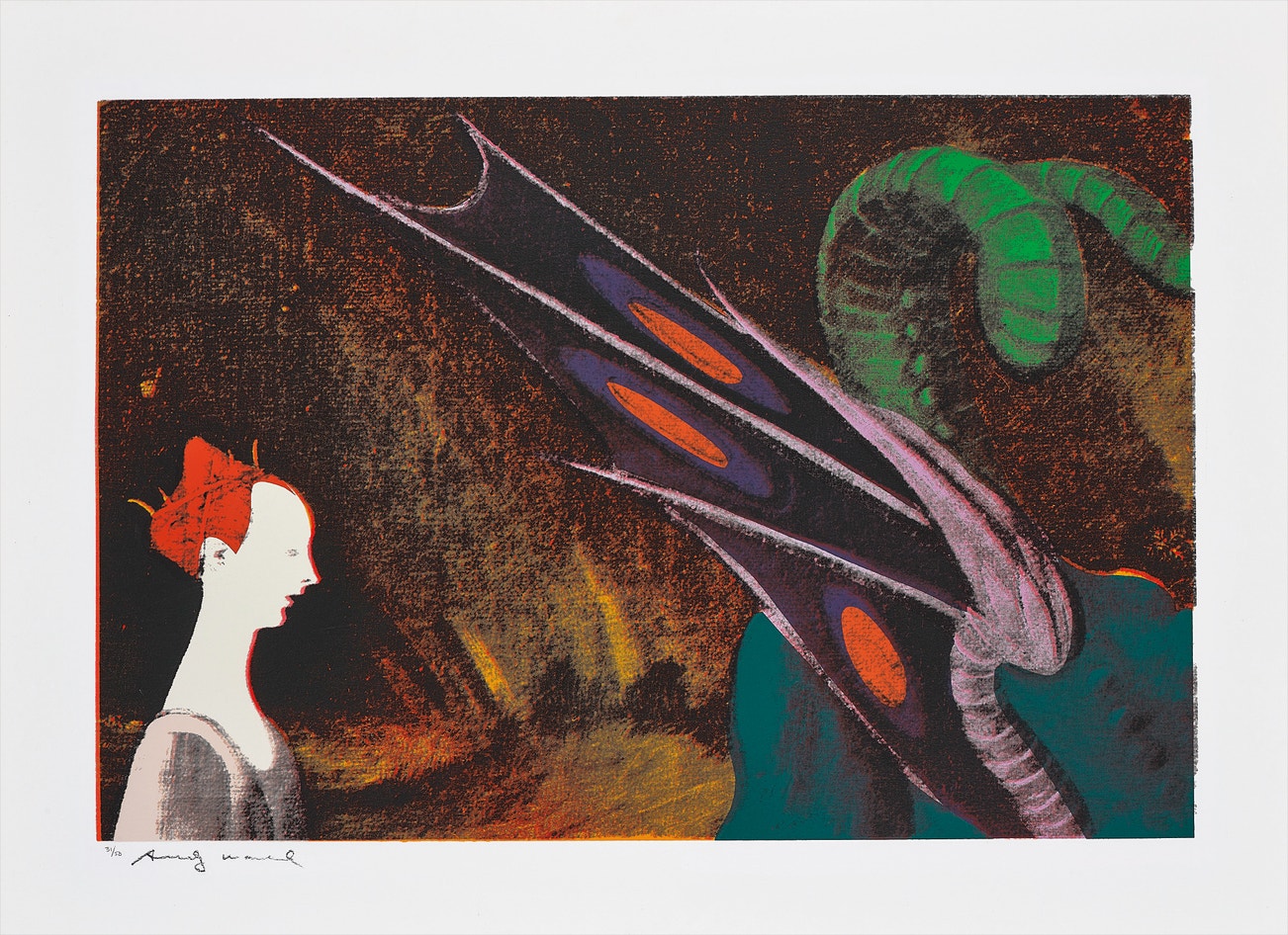 American | B. 1928 D. 1987Andy Warhol was the leading exponent of the Pop Art movement in the U.S. in the 1960s. Following an early career as a commercial illustrator, Warhol achieved fame with his revolutionary series of silkscreened prints and paintings of familiar objects, such as Campbell's soup tins, and celebrities, such as Marilyn Monroe. Obsessed with popular culture, celebrity and advertising, Warhol created his slick, seemingly mass-produced images of everyday subject matter from his famed Factory studio in New York City. His use of mechanical methods of reproduction, notably the commercial technique of silk screening, wholly revolutionized art-making.