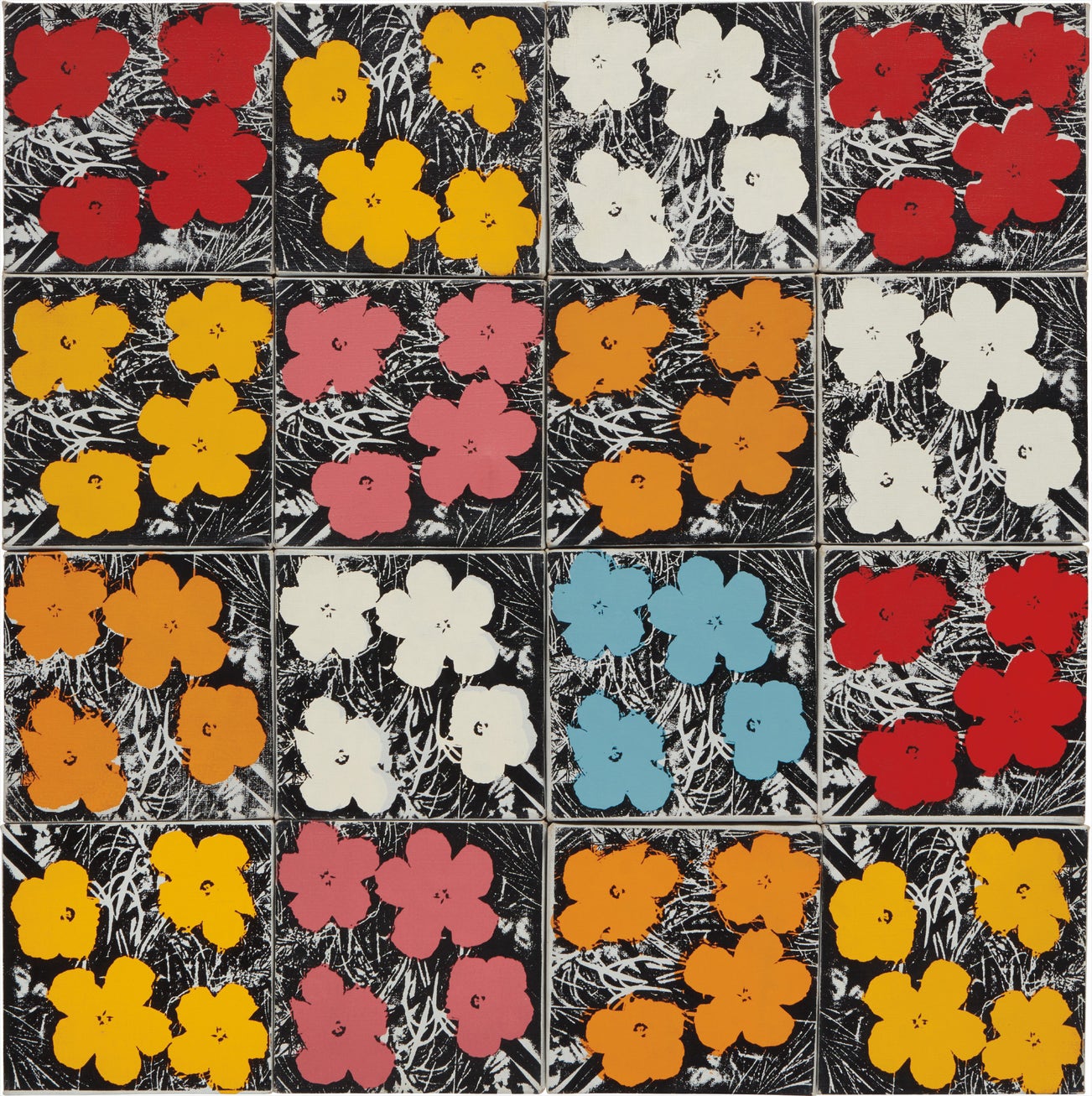When first exhibited at the Leo Castelli exhibition, Warhol juxtaposed Flowers with silkscreened portraits of Jackie Kennedy, prompting many to view these works as an extension of Warhol’s fascination with themes of death and tragedy. While the rich iconography of flowers in the tradition of still-life painting does indeed subliminally allude to mortality, Warhol’s Paris show seemed to expand on the notion of transience that flowers also embody. Here, 99 of the 8-inch canvases were hung floor to ceiling at evenly spaced intervals to create a panoramic installation that wrapped continuously around the walls of the gallery. Differences in the orientation of the individual paintings, which was deliberate on Warhol’s part as he conceived this as variable rather than fixed, ruptured the regularity of the pattern – rendering it contrapunctual and giving rise to the cumulative effect of cinematic movement.