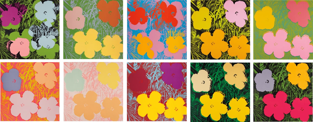 At attraction’s apex, these hibiscuses were most vulnerable, blooming in abundance for just fleeting moments — much like Warhol’s favorite movie stars. Only after some demise would he capture Marilyn Monroe and Liz Taylor. These ten screenprints were a clique of inevitably fading beauties verging upon surreal. At Factory Additions, Andy Warhol engineered the ephemeral into the immortal and ordinary into grandeur; no more so than in this wall-to-wall garden that alchemized commonplace florals into fresh buds that bloom on forever.