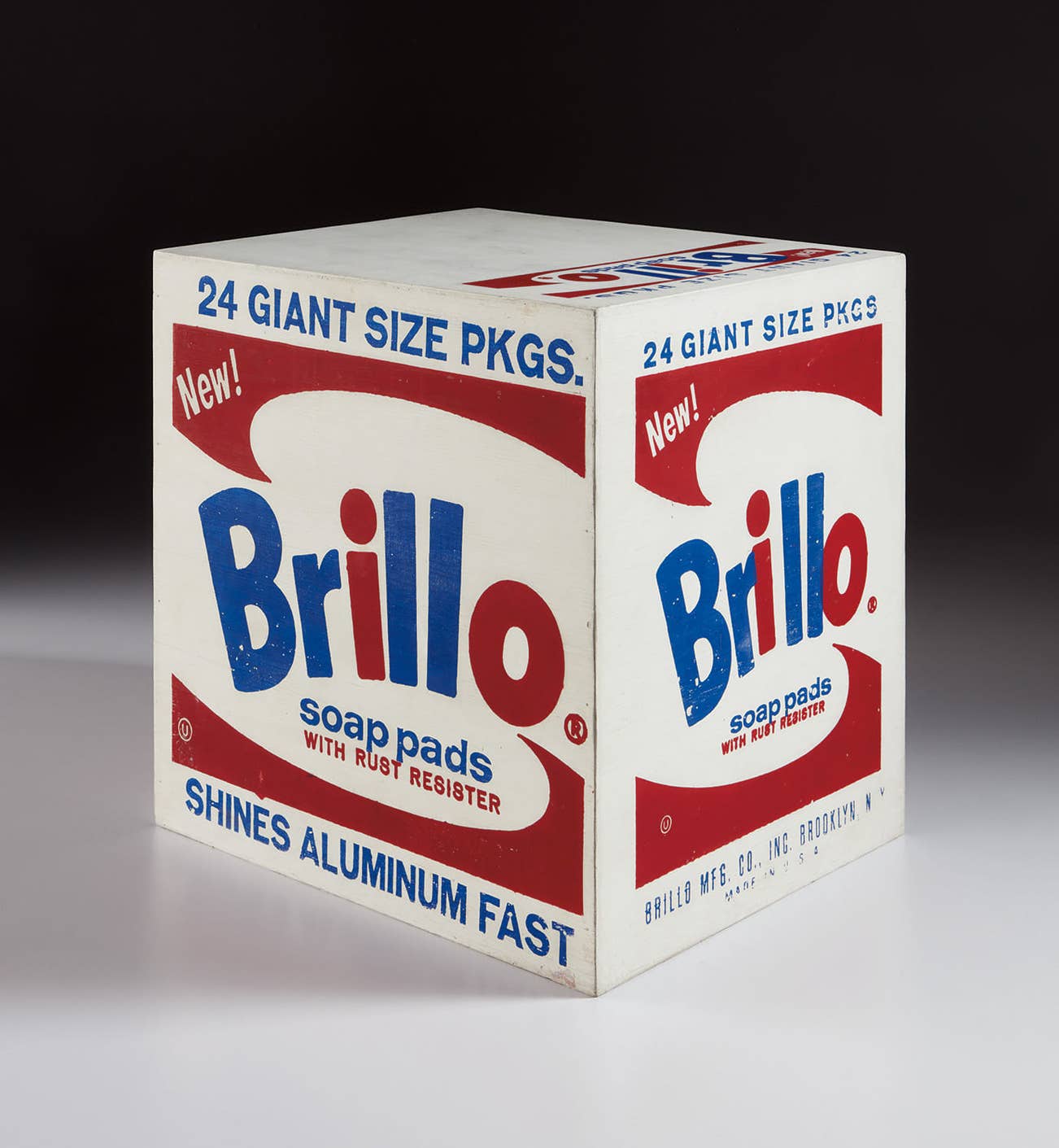 Massed floor to ceiling with Warhol’s various box sculptures, the Stable Gallery was transformed into what appeared to be a supermarket stockroom. The dazzling show became a rallying point for both those for and against Pop art; as Robert Indiana remembers, “The most striking opening of that period was definitely Andy’s Brillo Box Show” (Robert Indiana, quoted in Victor Bockris, Warhol: The Biography, Cambridge, 2003, p. 198). These so-called “stable boxes” set the foundation for two further discrete iterations on the theme, created for Warhol’s 1968 exhibition at Moderna Museet in Stockholm and his 1970 retrospective at the Pasadena Museum of Art. In a cutting indictment of the values of bourgeois culture, Warhol’s Brillo Soap Pad constitutes a deadpan cultural critique of a materialistic and mass-produced society that remains unparalleled in the history of American art.