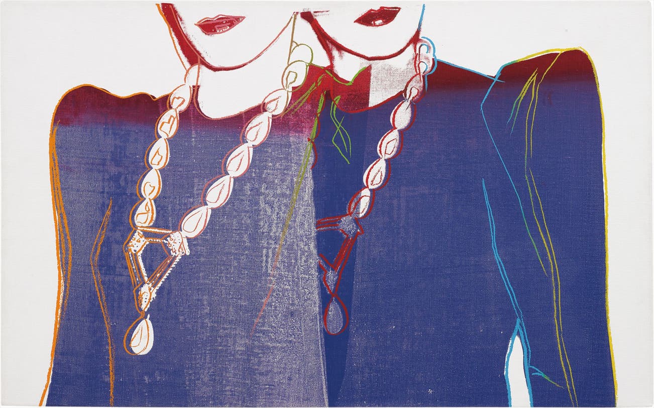 Fashion—Two Female Torsos with Necklaces, circa 1983, is a perfect embodiment of two of the styles of its day: aesthetic neutrality and the costumed flash of exaggerated ornamentation. Warhol’s silkscreen is fashioned from two photographs of the same subject taken from different angles. The clothing and decorative jewelry of the model evokes the earliest days of modern vogue, where sexual crossover was a standard feature of the fashion world. The immaculately bleached white skin and large shoulder pads of the subject provide competing narratives: that of a French aristocratic sense of beauty and that of a modern businesswoman. This contradiction was an inherent feature of 1980s fashion, where the model was a product of multiple trends and multiple eras. In addition, Warhol draws special attention to the anonymous shape of his figure, outlined in a series of bright reds, blues, and golds. The necklaces, undoubtedly the most severe feature on the model, are emblematic of the era in which Warhol created his painting: extravagant, illuminated, and, of course, finished.