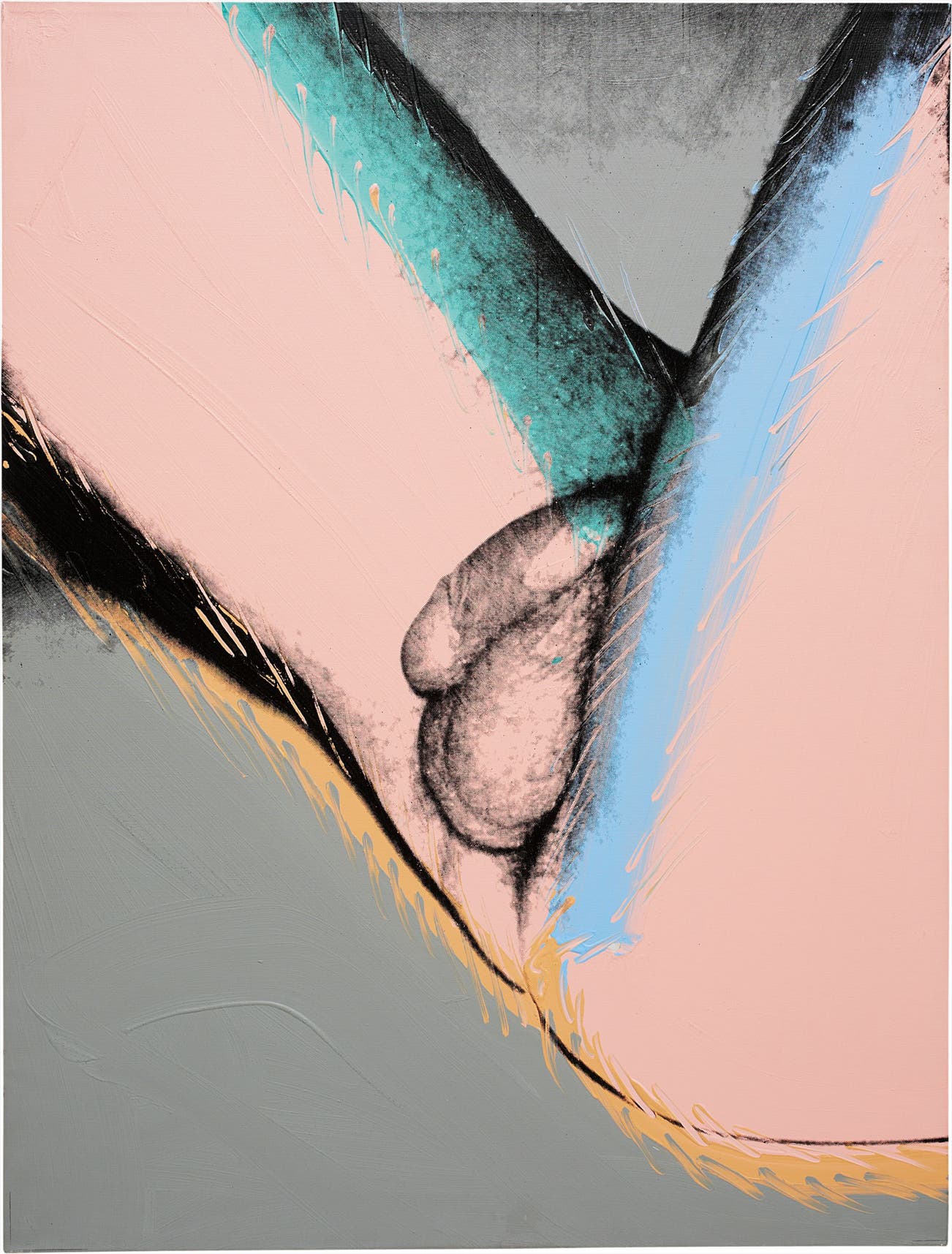 Throughout Warhol’s vast and varied output of images, the whole human body is never fully rendered in his oeuvre. The intensification of the close-up, exemplified in the present lot, represents nearly all of Warhol’s small series of the naked human body. Most interesting is the framing of the nude works; heads are excised from the pictures, leaving the subject’s identity a mystery. This close-crop of the subject, focusing exclusively on an intimate fragment of the sitter, hearkens back to Courbet’s L'Origine du monde; however, here the form is accented with bold hues in hand-painted. The application of dramatic tones infuses the painting with a commerciality that recalls the vibrancy of Warhol’s earliest silkscreens—Marilyns and soup cans.