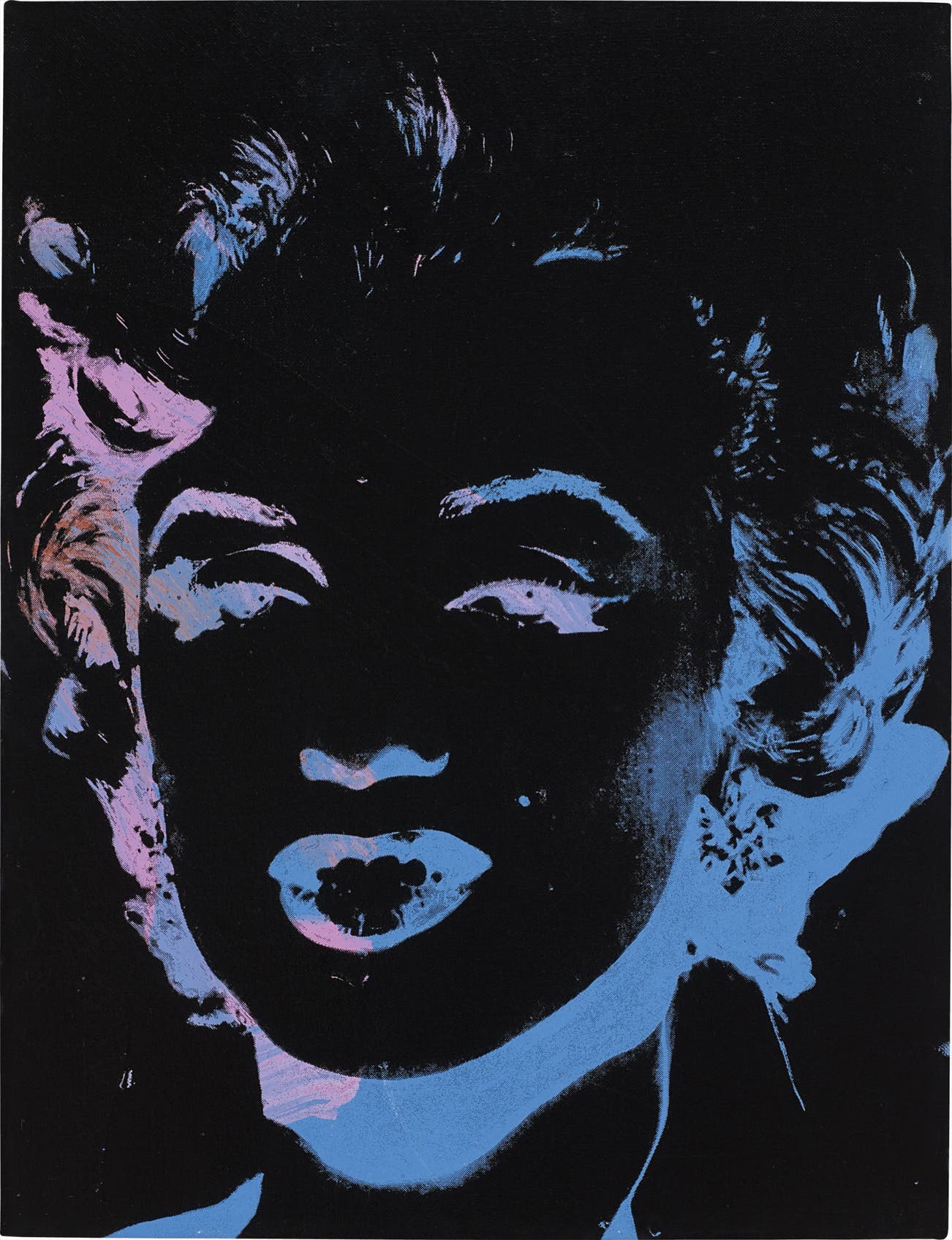 An electrifying combination of neon blue heightened with powdery pinks and purples, One Multicolored Marilyn is Warhol’s transfigurement of the Hollywood star in an inverted palette, relying upon the canvas’s negative space to recapture Monroe’s glamour. Echoing yet inverting his earlier impressions, Warhol’s Reversal here derives not from the icon’s youthful features, but from the absence of color in juxtaposition. Elaborating upon the philosophy behind the production of his silkscreens, and the later Reversals, the artist noted in 1975: “I really believe in empty spaces, although, as an artist, I make a lot of junk. Empty space is never-wasted space. Wasted space is any space that has art in it. An artist is somebody who produces things that people don’t need to have but that he, for some reason, thinks it would be a good idea to give them.” In One Multicolored Marilyn, it is the absence of color that intimates the legacy of a fallen idol, now etched into the collective memory of a bygone era – a shadow of her former self, the colors call forth Monroe’s powerful spirit. In this sense, Warhol invites us into his psyche, and that of his subject: “Warhol’s Reversals recapitulate his portraits of famous faces…but with the tonal values reversed. As if the spectator were looking at photographic negatives, highlighted faces have gone dark while former shadows now rush forward in electric hues. The reversed Marilyns, especially, have a lurid otherworldly glow, as if illuminated by internal footlights” (D. Bourdon, Warhol, New York, 1989, p. 378).