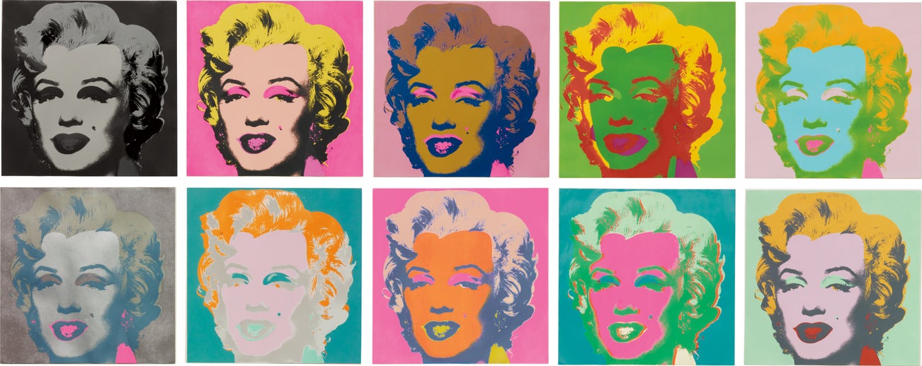Warhol first created a silkscreen of Monroe in 1962, just weeks after her death at the age of thirty-six. He used a publicity still from her 1953 movie Niagara. The archetypal picture of Monroe in ascension to stardom, this photograph presents a relaxed and sensuous visage: suggestively parted lips, perfect hair, an inviting and smoky gaze. It is a face guilelessly at odds with the brutal and unrelenting serialisation to which Warhol would subject it.