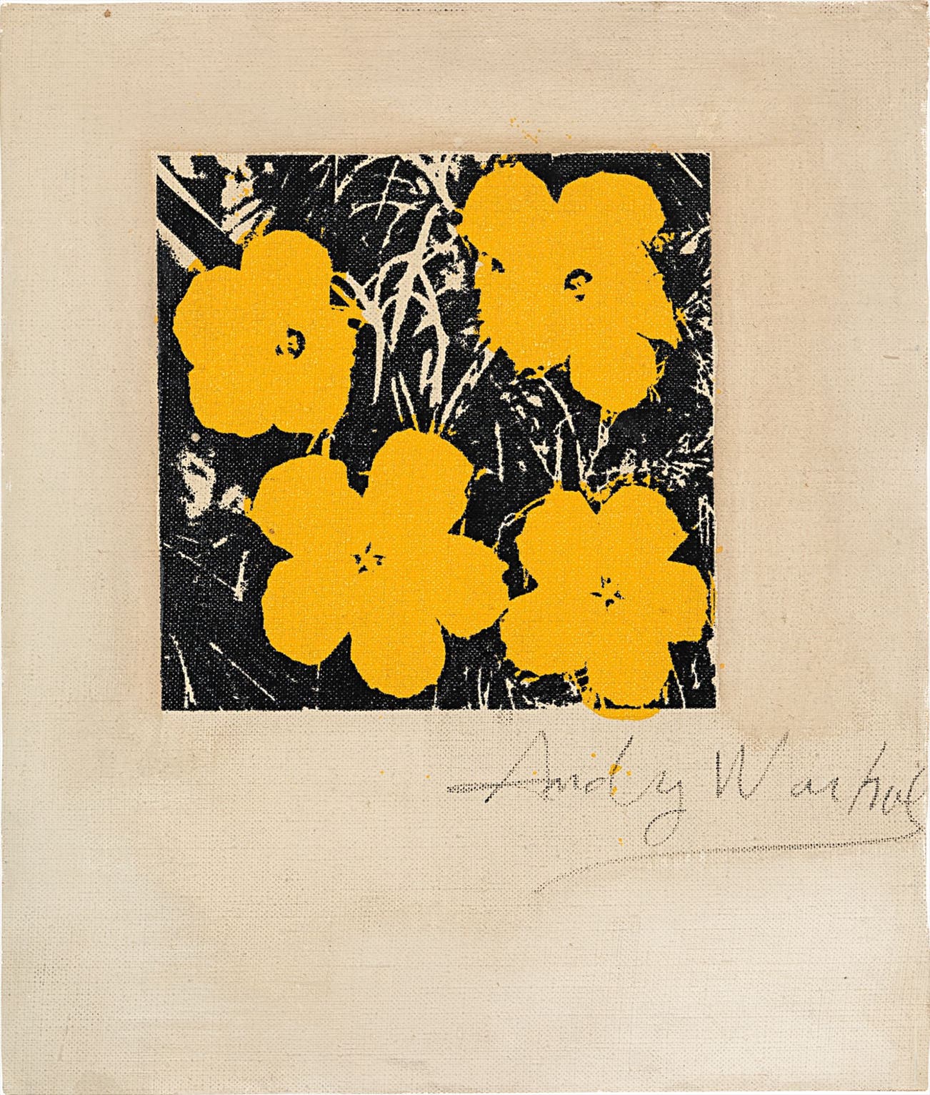 Andy Warhol’s Flowers are an iconic series in oeuvre the pop artist. Flowers (Four Yellow), 1964 is a brilliant example of Warhol’s most remarkable themes: serialisation, beauty and creation of immortal icons. Placed on a black background, the four yellow flowers are swallowed up in the darkness. The conception of Flowers overlapped with Thirteen Most Wanted Men, a controversial mural of criminals’ photos that Warhol created for the 1964 World’s Fair. Warhol himself noticed the connection between flowers and felons: ‘Mr Golden (the printer) make in black + white line sort of / make like my 13 most wanted men’. (Frei and Printz, The Andy Warhol Catalogue Raisonné, vol.02A:293). Viewed under this light, the flowers seem to assume funerary connotations.