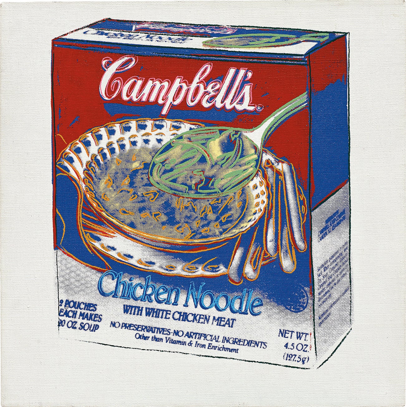 Warhol’s serial technique is often hailed merely as triumphant reaction to mass-produced copy. However, the artist’s late works in particular demonstrate his visual variations as products of his individual strategy. Unlike commercial images, where image selection precedes its mass production, Warhol reproduces a series of unique variations on the same image, altering colours and also in his late works adding depth and additional outlines. The present Campbell’s Chicken Noodle Soup Box encompasses both the subject matter that launched Warhol’s career and also the stylistic elements central to his later creative oeuvre. Reflecting on his career, Warhol stated 'I should have done the Campbell’s Soups and kept doing them' (Andy Warhol, quoted in Benjamin H. D. Buchloh, ‘Andy Warhol’s One-Dimensional Art: 1956–1966’, Hal Foster and Gordon Hughes, eds., October Files, London, 2001, p. 30).