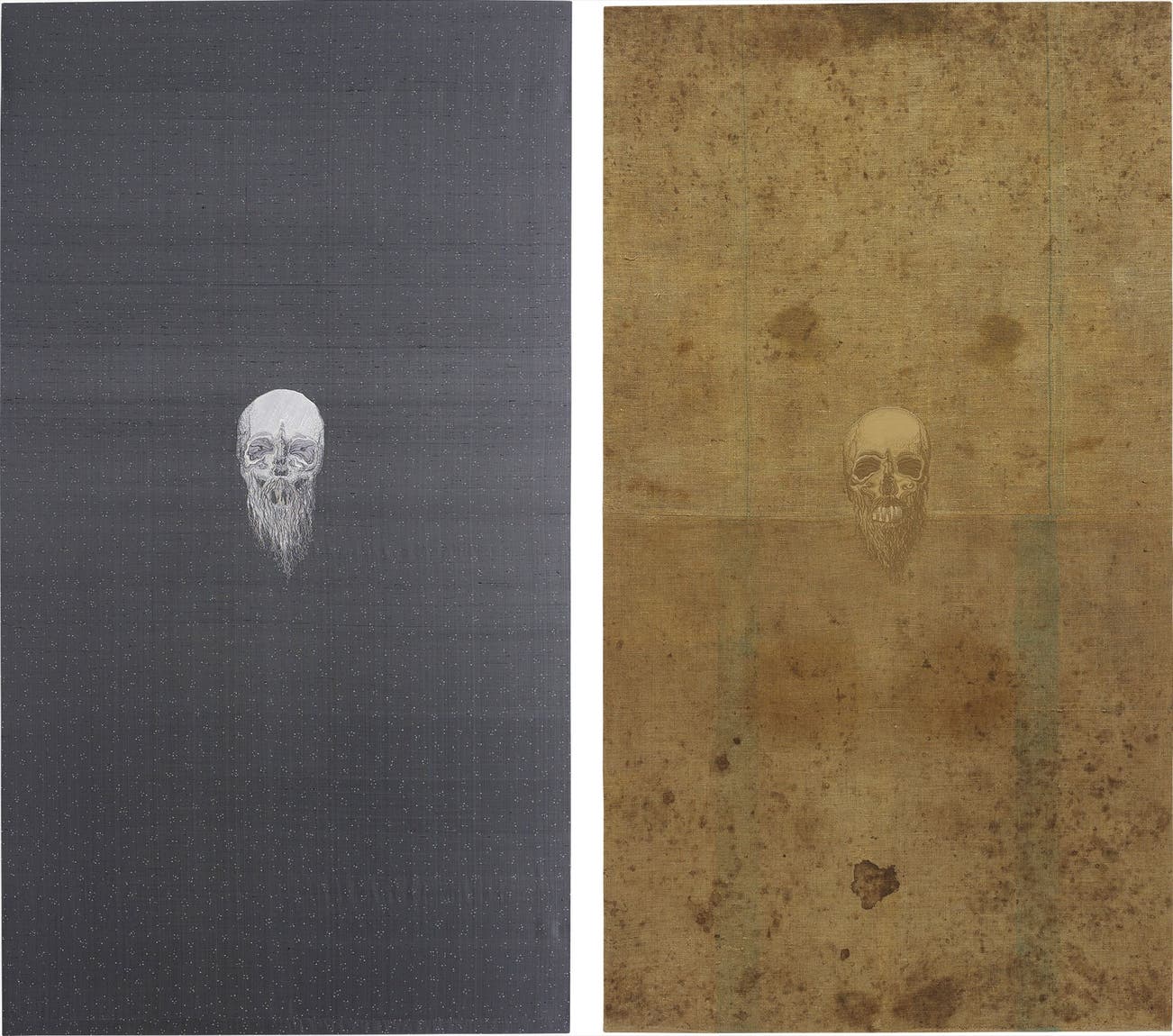 left panel: embroidery on recycled black olive burlap bags laid on linen; right panel: embroidery on silk shantung with crystals laid on linen