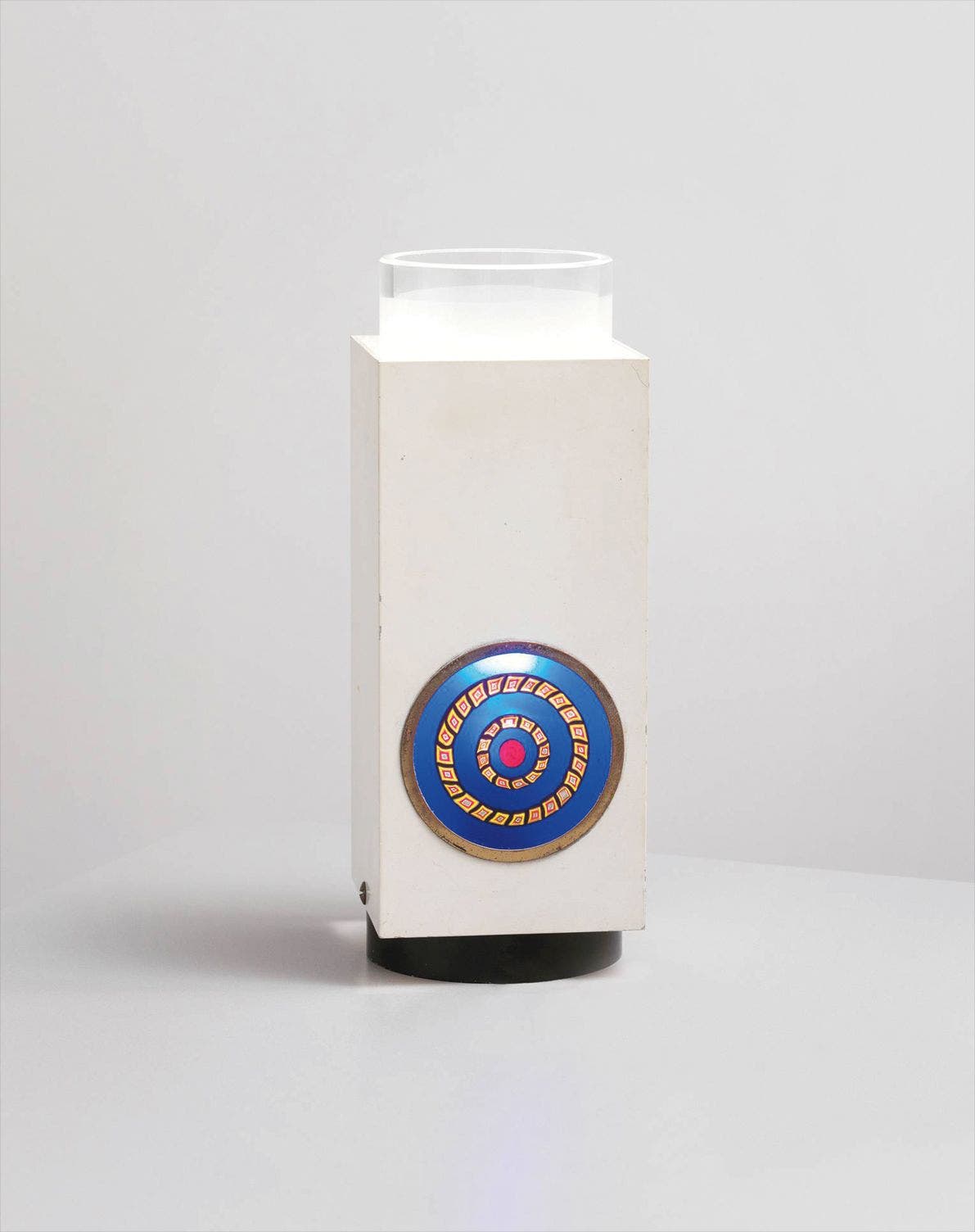 Painted aluminium, clear and partially frosted glass, murrine glass.