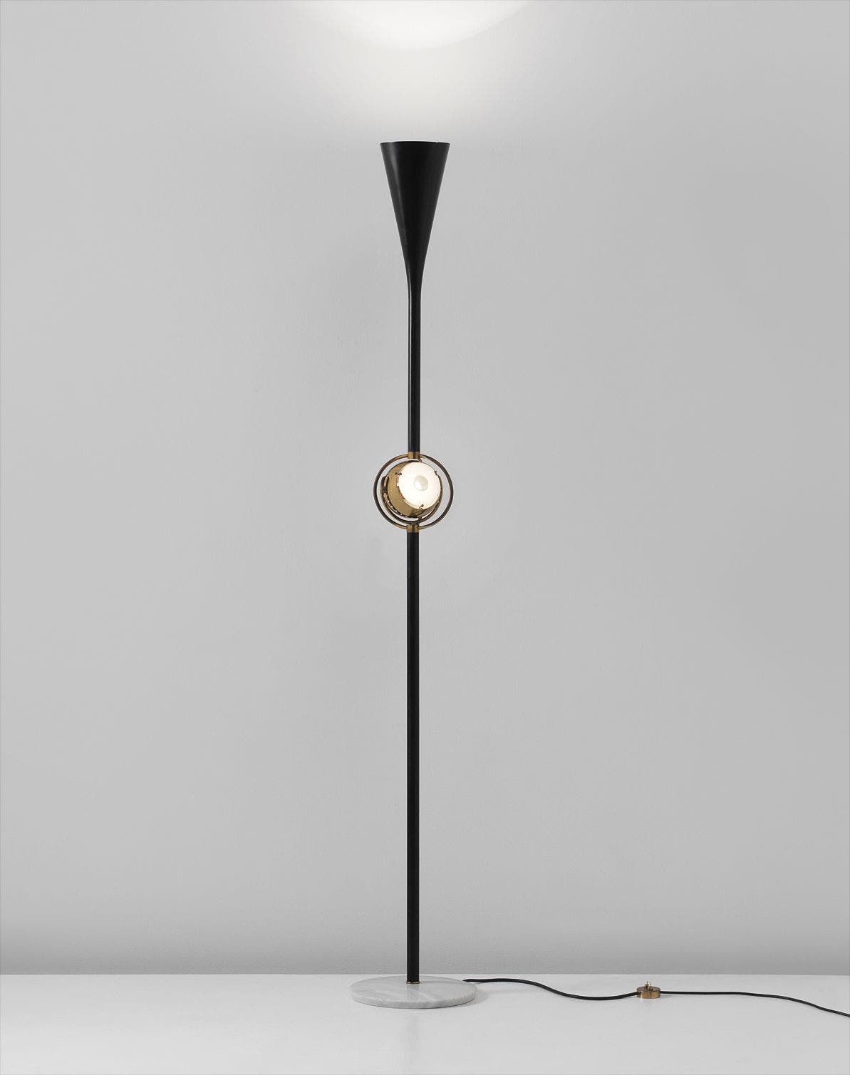 Painted metal, brass, marble, glass.