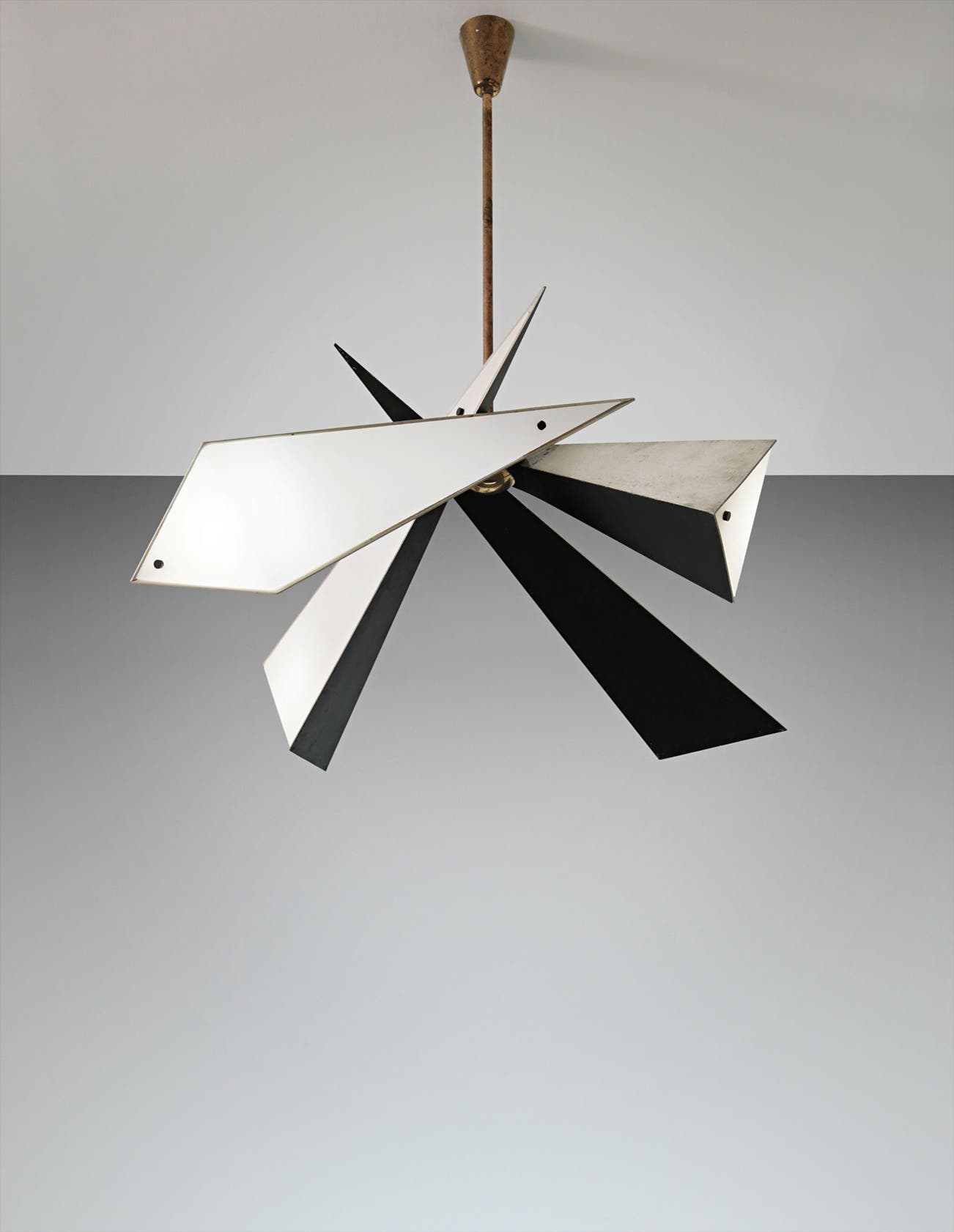 Painted aluminum, painted brass, brass, tubular brass, opaque glass.
