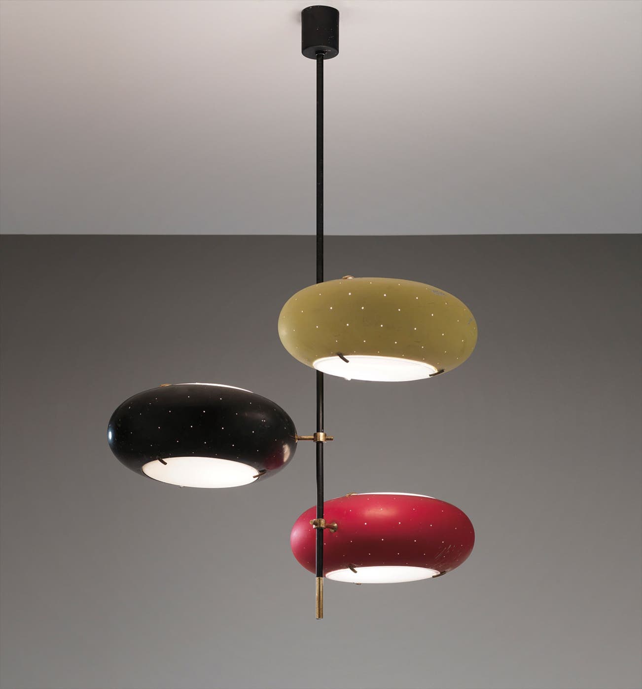 Brass, painted tubular metal, painted metal, opaque glass, frosted glass.