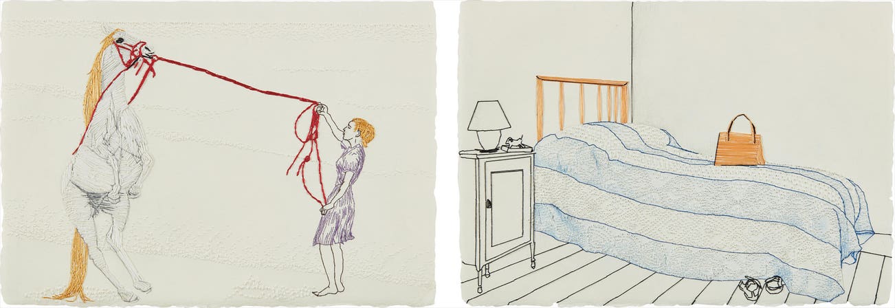 Two unique works with mixed media, including graphite and sewing string in colors, on sewn wove paper.