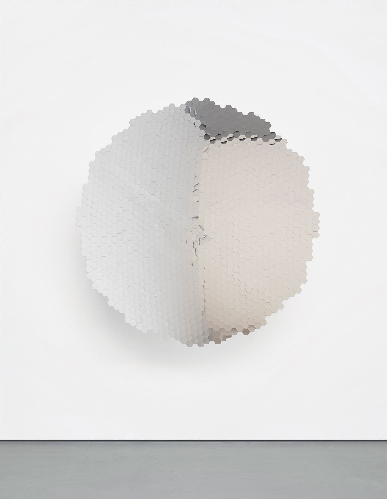 A round mirror of stainless steel, Untitled radiates with its hundreds of fragmented and reflective hexagonal shapes. Viewers are confronted with a curved surface that delicately arcs inwards, causing their own reflection to be inverted upside down. This spatial model, defying both the deep pictorial space of the Renaissance perspective and the flatness of modernist abstract painting, renders the status of the present object uncertain. For Kapoor, ‘space is perhaps one of the only truly abstract entities. One of the things about the mirrored objects, and especially the forms that are inside-out, is that they seem to be very active, to be in various states of becoming’ (Anish Kapoor in conversation with Nicholas Baume, exh. cat. Anish Kapoor: Past Present Future, 2008, Institute of Contemporary Art Boston, p. 52).