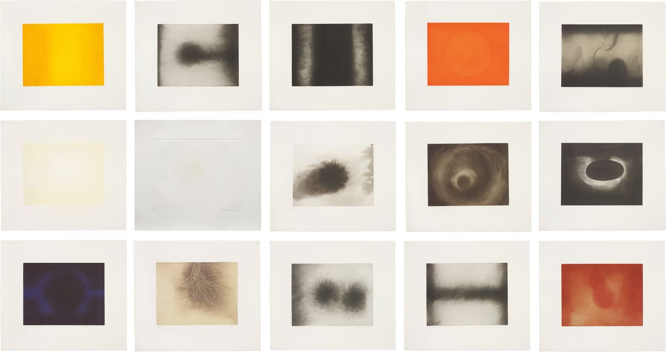 The complete set of 15 etching and aquatints in colors, on Zerkall paper, with full margins, all contained in the original black velvet-covered portfolio.