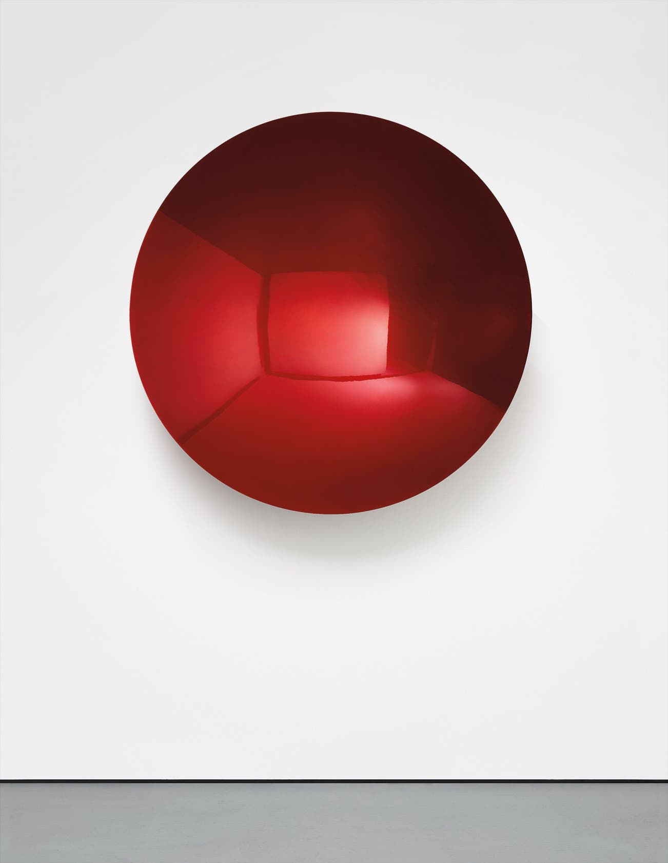 Depth, concavity and reflectiveness impress upon the work, but so too does its bold colour. The disc’s bright, deep red surface physically alters the space that it consumes. Kapoor acknowledges that ‘colour is a real transformer. It changes things very directly... Recently I have tended to work more with space, with conditioning the space in such a way as to bring about different states of being.’ (G. Celant, Anish Kapoor, Milan 1998, p. XXXI). The red surface allows the work to subvert the space in which it is contained, interpreting its surroundings within its own interior. This ruby lens allows the viewer to revaluate and re-engage with the place in which the sculpture sits as well as their own self; at the same time, the alluring and metallically seductive red hue seems to slip out into its environs.