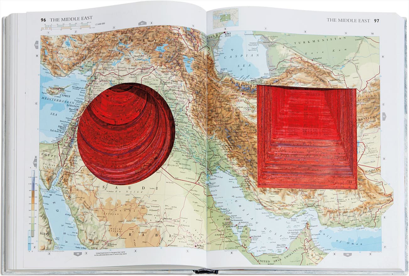 Book comprised of World Atlas pages, with cut-out and hand-painting in colors, bound (as issued),