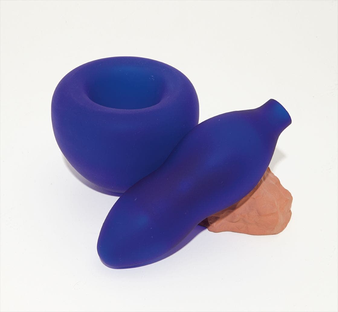 The complete three part vase consisting of two blue frosted-glass vessels and one terra cotta base, with accompanying booklet,