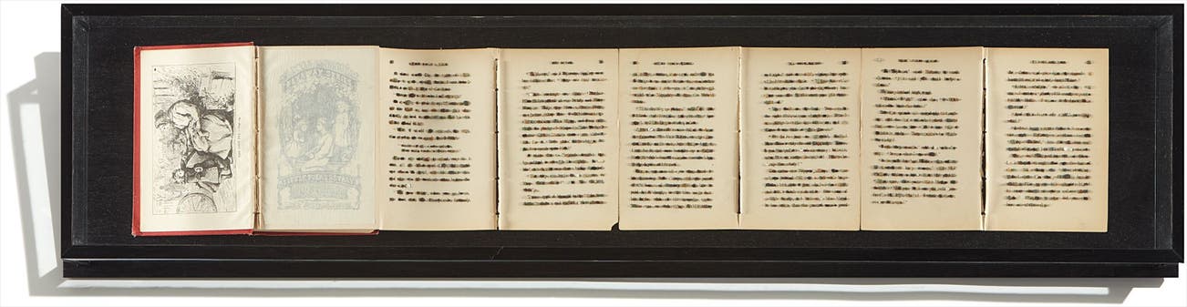 Book, bookpages, and stones in a lacquered birch and glass case,