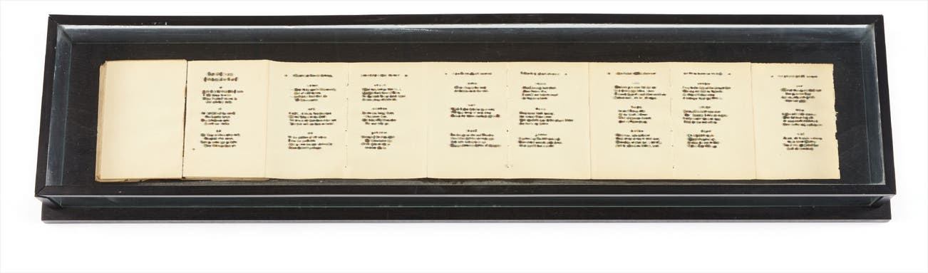 Book, bookpages, and stones in a lacquered birch and glass case,