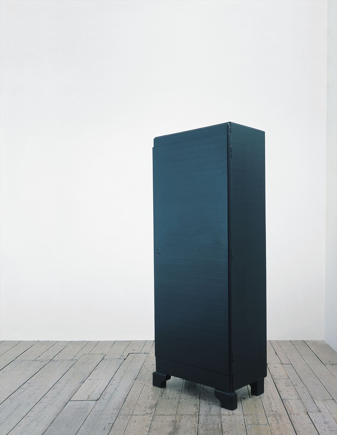 Black Wardrobe is a bureau wrapped seamlessly in tape. Anna Barriball used obsessively repeated actions to press and rub the tape into the cupboard’s surface so that the coating forms a second skin that reveals the dresser’s most minute textures. Suffocated in black, the cupboard is almost unrecognisable as a solid form, becoming instead a monumental void connoting absence and memory. Through her intensive process, Barriball unveils a mystery in the domestic and familiar. Her work alludes to a synaesthesia of sight and touch, where senses merge and become heightened.