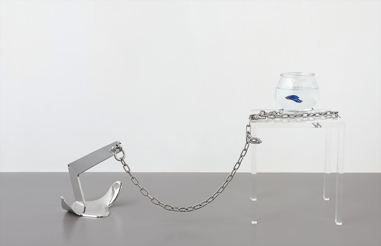 glass bowl, water, Betta fish, polished stainless steel and Plexiglas