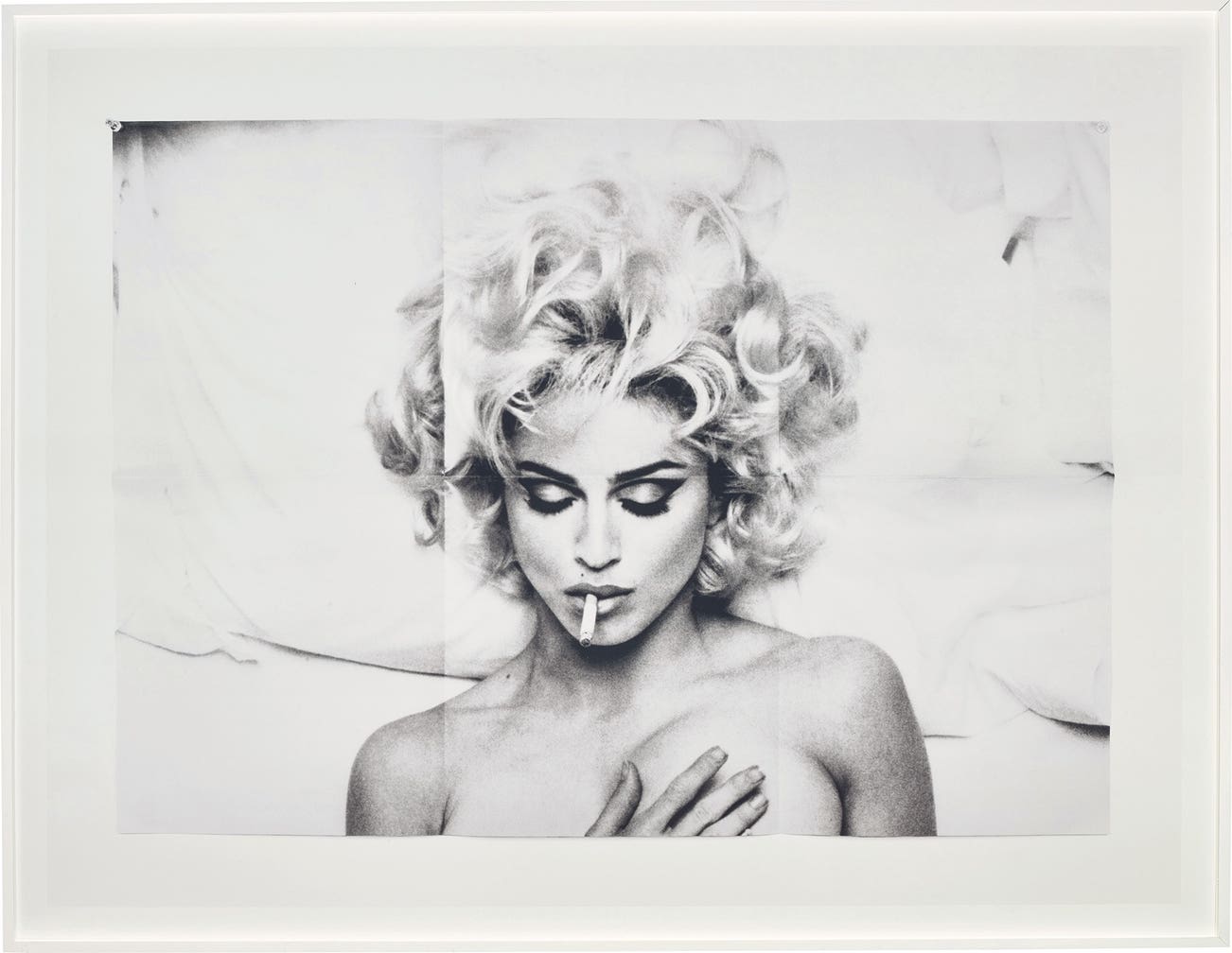 A once-folded poster of Madonna from a photograph taken by Steven Meisel for her 1993 single ‘Bad Girl’ is pinned in the top two corners to a white wall. Photographing found objects and appropriated imagery, Anne Collier questions the ways in which these images are presented and perceived, aiming to elicit ‘a sense of emotional or psychological uncertainty’ through her image-making process. In Folded Madonna Poster (Steven Meisel), she transforms the object into the subject and asks us to join her in analysing the process of perception and presentation. The title of the work highlights that this is a picture within a picture; we know both what we are looking at (a folded poster of Madonna) and by whom the image was originally taken (Steven Meisel). In acknowledging these two aspects, Collier draws our attention to how this image was initially presented and consumed. Influenced by the work of Cindy Sherman, Laurie Simmons and other ‘Pictures Generation’ artists, Collier re-contextualises popular imagery and visual clichés. She challenges how photography structures our ways of seeing by drawing our attention to these mechanics as seen in the present work.