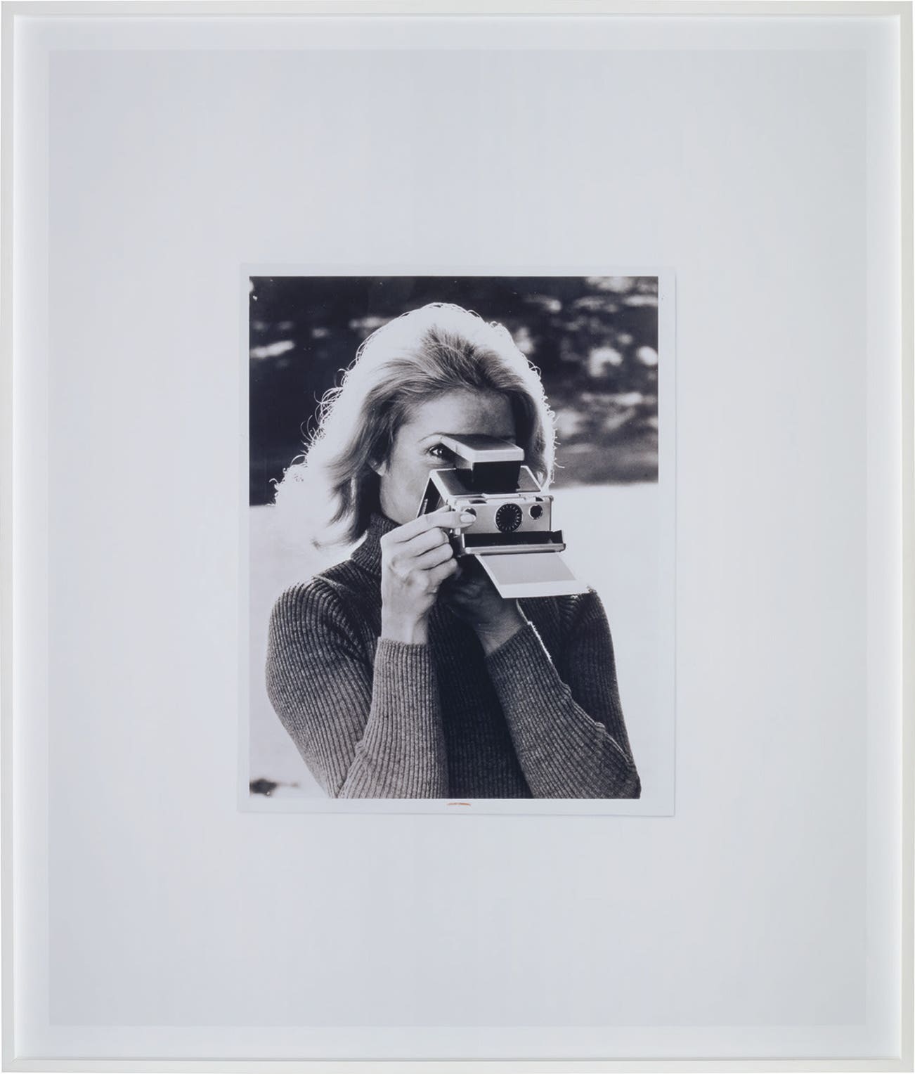 Her image-making process, combining still-life photography with use of appropriation, questions the ways in which these images are presented and perceived. Here, we are confronted with a photograph of a photograph of a woman in the act of photographing – a Polaroid print ejecting from her camera. Through her multi-layered imagery, Collier aims to elicit ‘a sense of emotional or psychological uncertainty’ in her exploration of the power dynamics of taking pictures.
